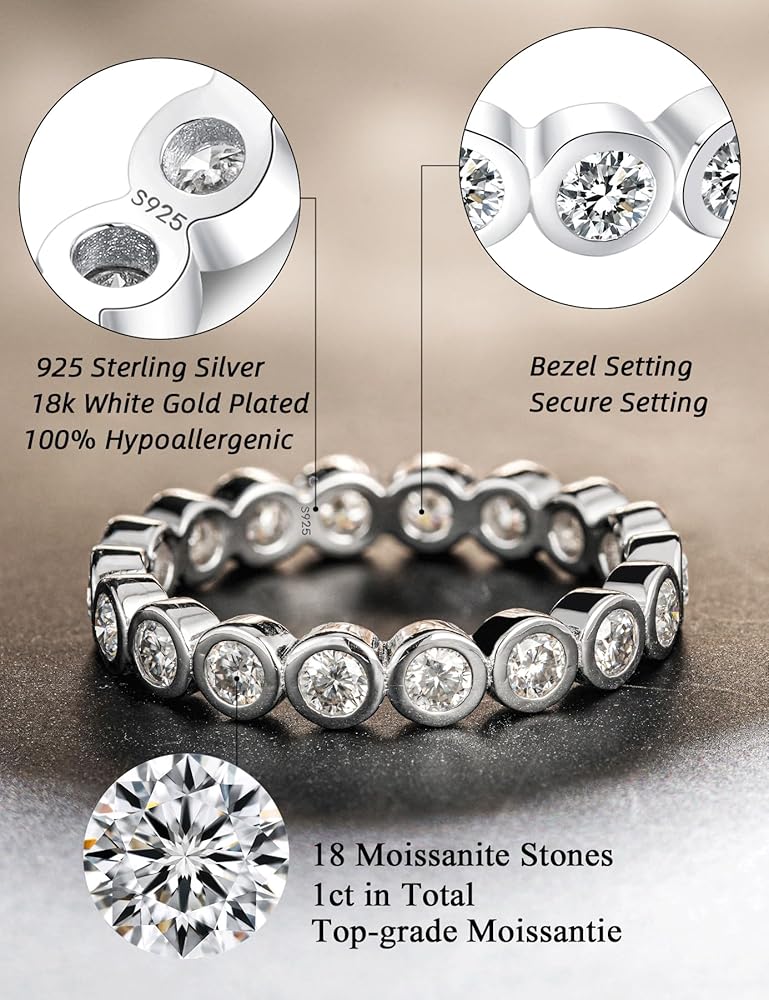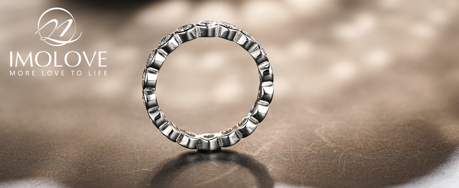 IMOLOVE Moissanite Wedding Bands for Women, Trendy 1 Carat Stackable Eternity Bezel Set Band Rings Everyday Fashion Silver Moissanite Rings for Women with 18K White Gold Plated Size 5-10