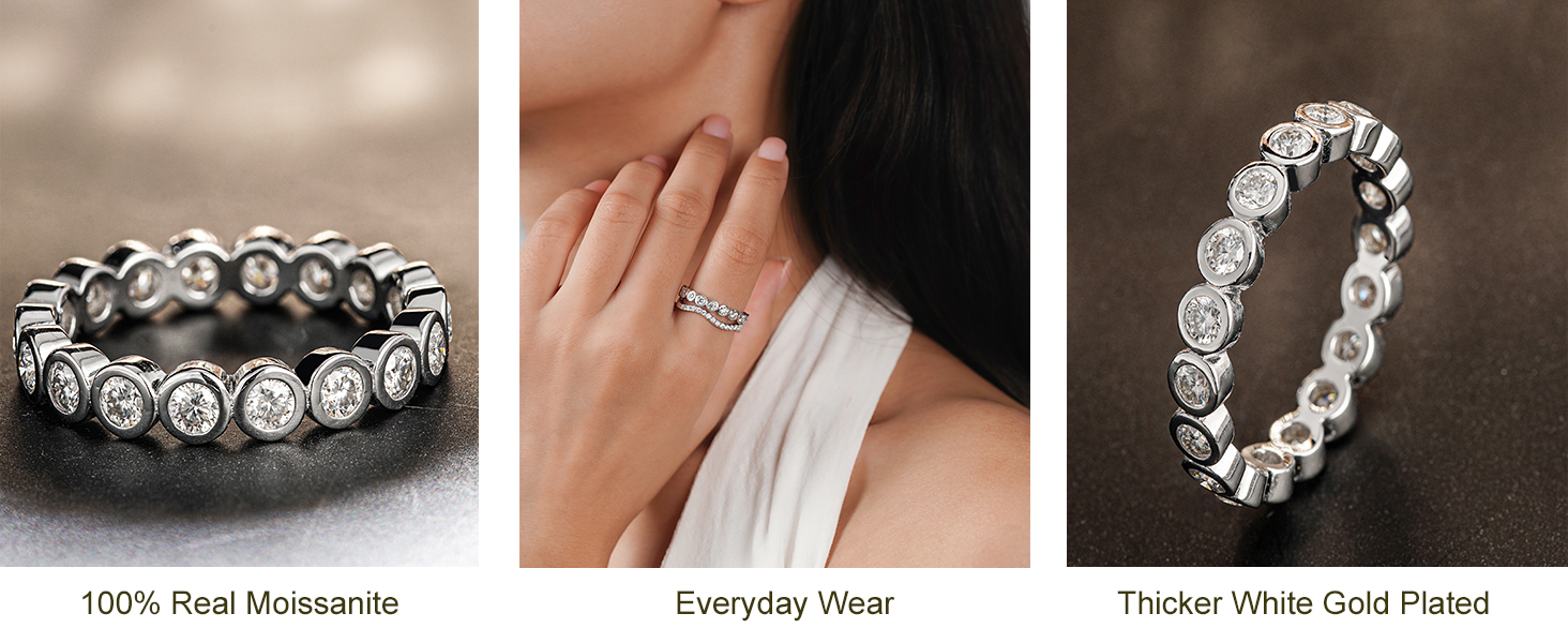 【100% Real Moissanite with More Sparkle】The stackable bezel set ring is made of 100% REAL MOISSANITE, which is as hard and shinny as natural diamond. Moissanite won't tarnish or discolor and it is more cost-effective than diamond.