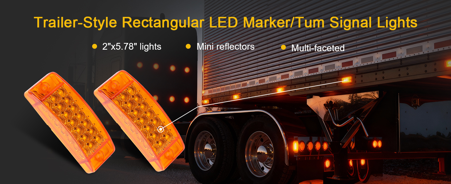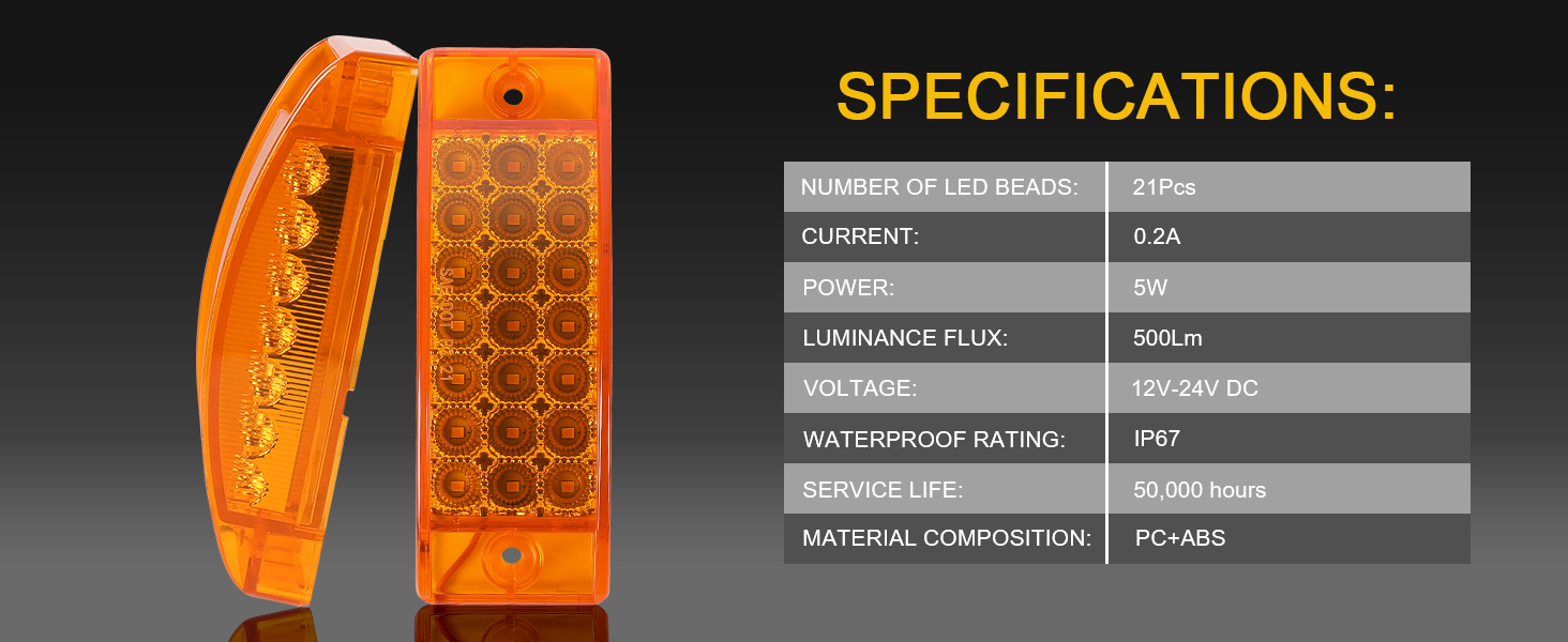 Package Includes: 2pcs 5.78 x 2-inch amber rectangular trailer marker LED lights, featuring a 3-wire surface mount design. Each amber light contains 21 LED diodes; operating voltage 12V DC; sealed amber LED lights with 3-wire installation structure and high/low beam functionality. No additional accessories included.