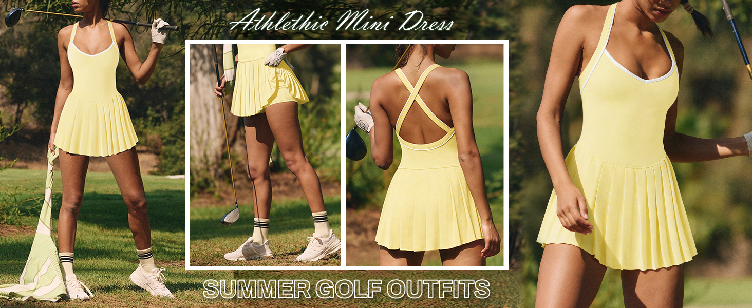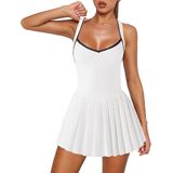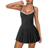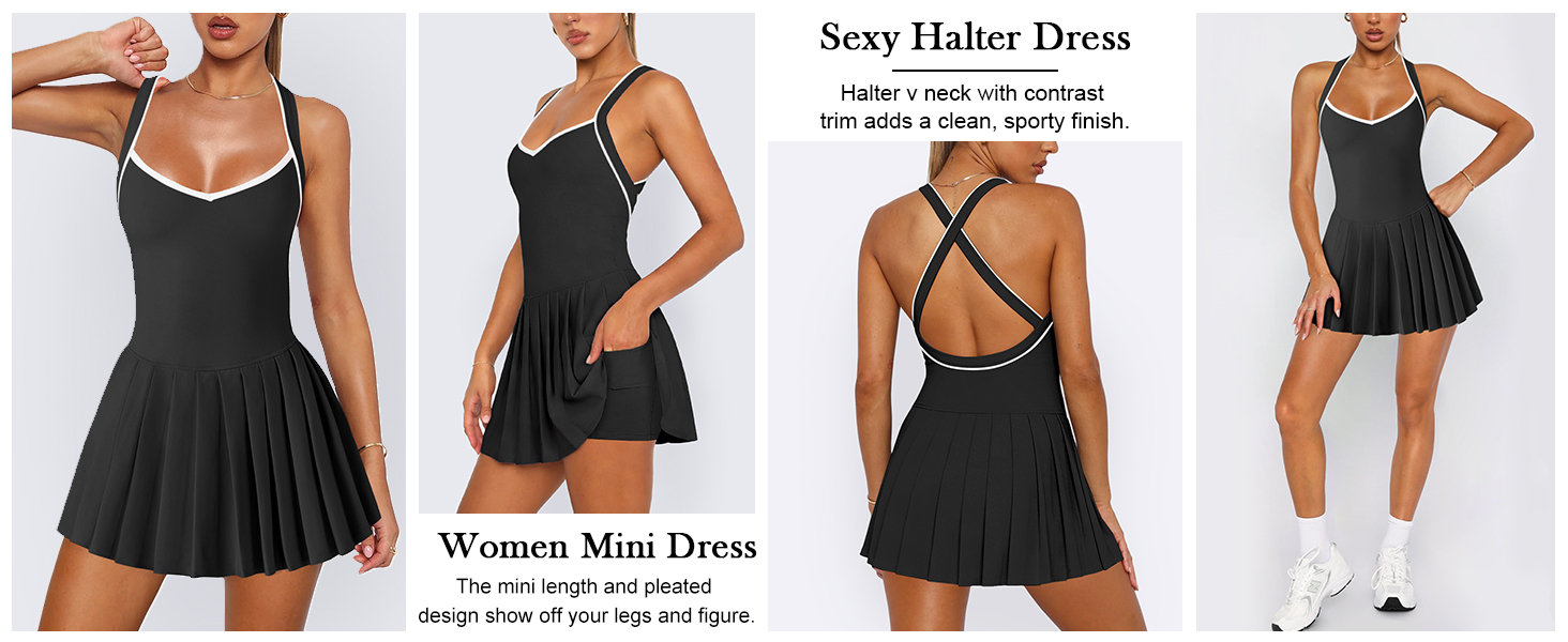 【Features】: Sexy mini athletic dress features halter v neck, fixed cross-back shoulder straps, mini length, no-built in padding or bra, a pleated skirt with built in shorts with pockets underneat. The pleated skirt and fitted bodice create a flattering silhouette that accentuates your curves and highlights your waistline.