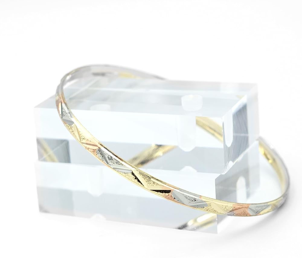 Add a touch of bohemian elegance to your jewelry collection with this striking tri-tone bangle bracelet. The intricate tribal arrow design weaves seamlessly across the surface, expertly crafted in a harmonious blend of rose gold, yellow gold, and silver tones. This gold-filled cuff bracelet features a comfortable 2.5-inch diameter, making it perfect for everyday wear. The sophisticated pattern creates a mesmerizing play of light across the metallic surfaces, while the sturdy construction ensures lasting beauty. Whether worn alone as a statement piece or stacked with other bracelets for a more dramatic effect, this versatile bangle adds the perfect finishing touch to both casual and dressy outfits. The timeless design draws inspiration from traditional tribal motifs while maintaining a contemporary appeal that works beautifully with modern fashion sensibilities.