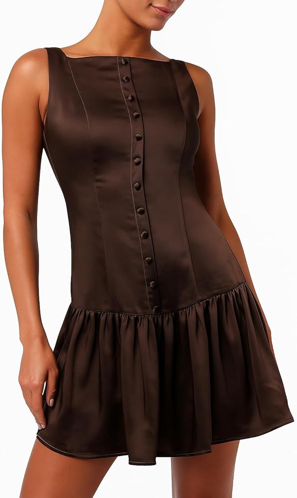CHIC DESIGN: Sleek satin mini dress featuring a sleeveless drop-waist silhouette with a flattering apron neckline for a polished, modern look