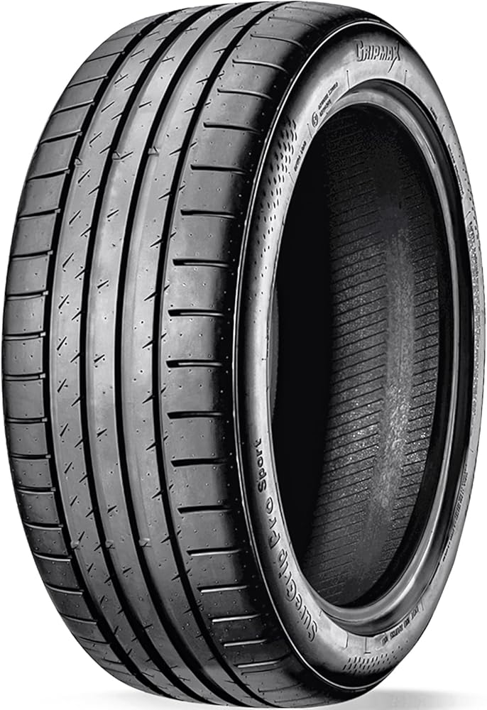 The Gripmax SureGrip Pro Sport is an ultra-high-performance summer tire designed for use on passenger cars, SUVs, and sports cars, offering precise steering control, directional stability, and enhanced grip, braking, and traction in both dry and wet conditions. Its optimized, asymmetric tread pattern features a sturdy central rib and deep notches. This design ensures consistent steering feedback and traction at high speeds on paved roads, providing a confident and controlled driving experience.