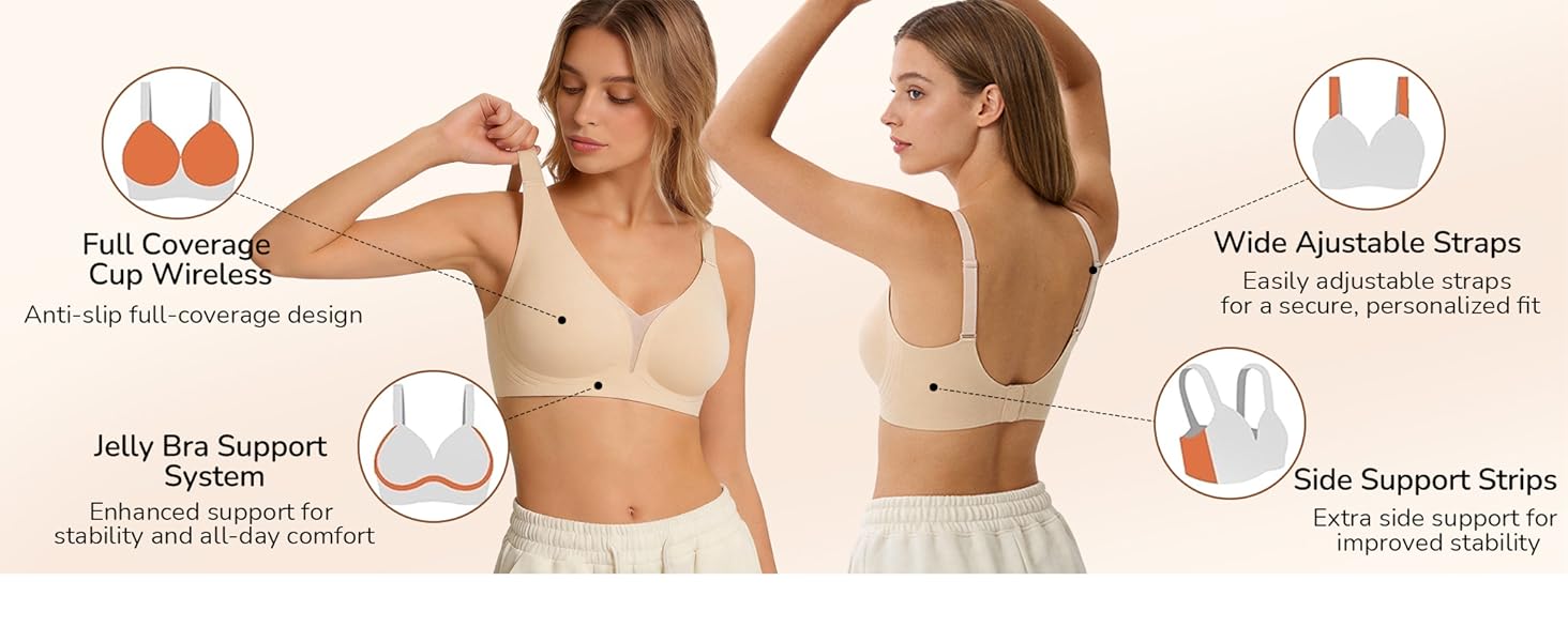 Wireless Jelly Strip Support: 4-layer 360° jelly strip support system delivers strong lift and bounce control without underwires, mimicking traditional wire support while staying soft, flexible, and non-digging for true all-day comfort