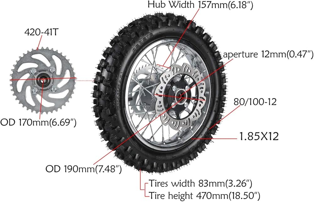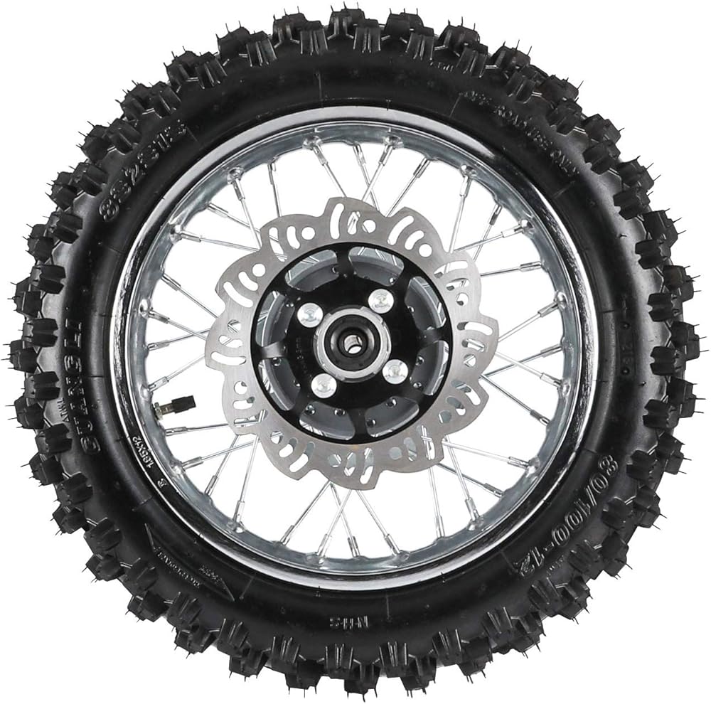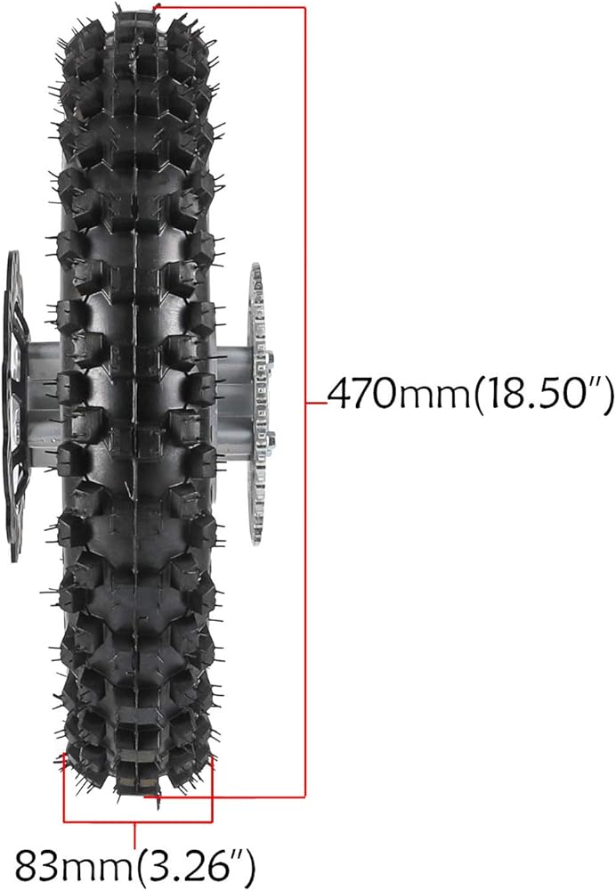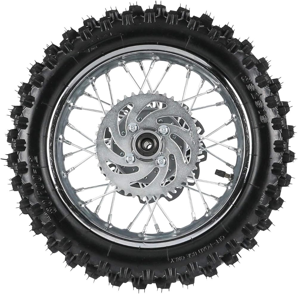 Package include: 1 x Rim + 1 x 3.00-12 knobby tire + 1 x Inner tube + 1 x Wheel bearings + 1 x Sprocket + 1 x Brake disc rotor