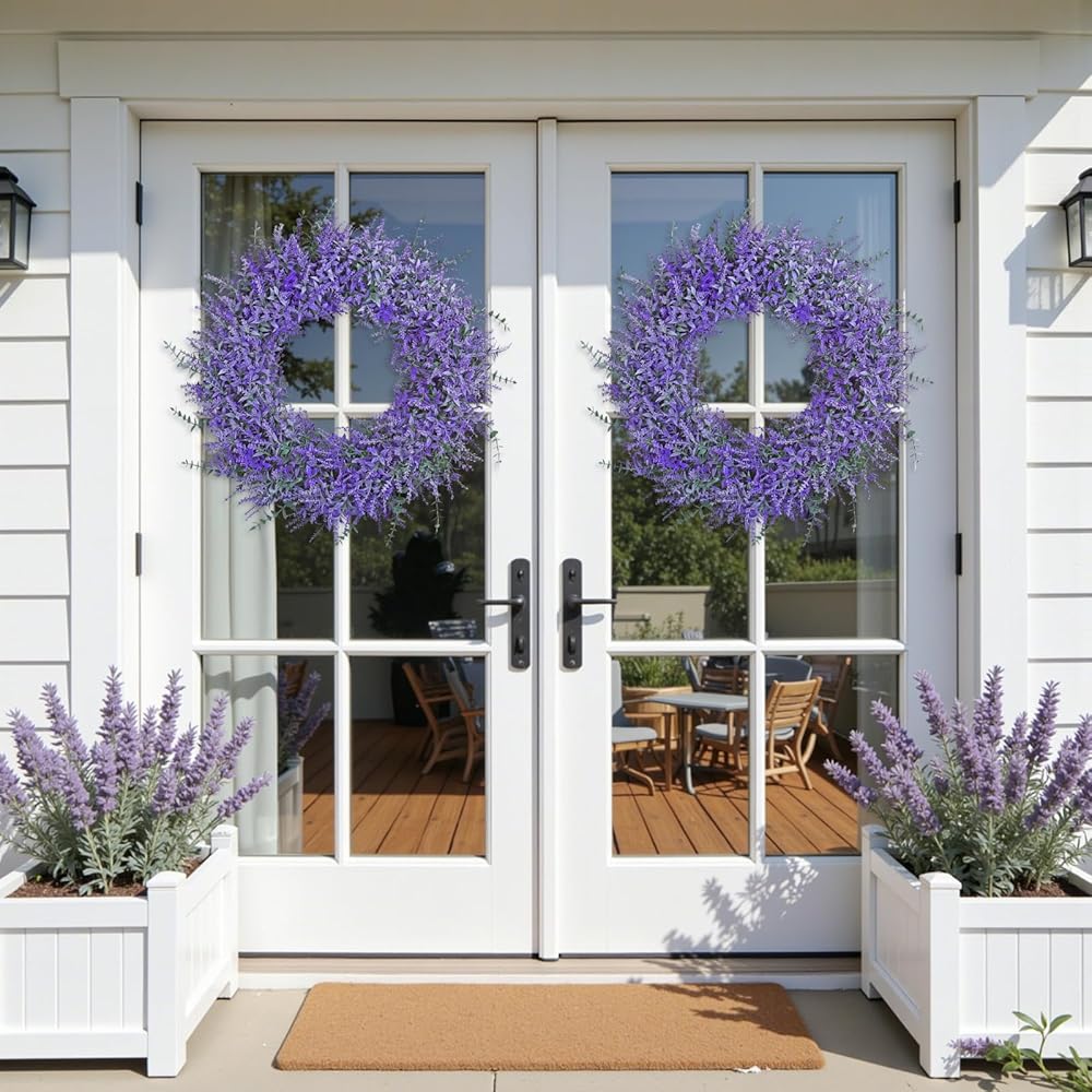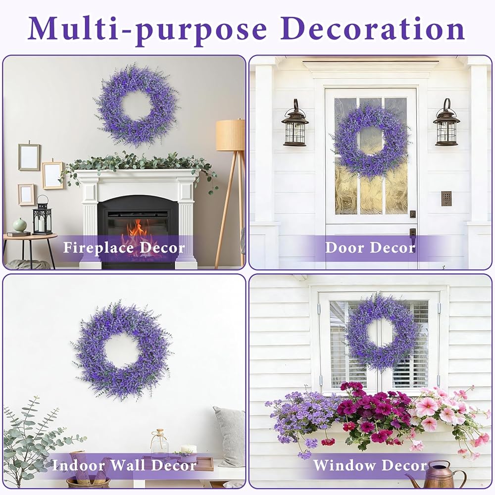 【Sturdy&Long-lasting Use】This romantic purple lavender wreath for front door is made of high-quality plastic and fade-resistant artificial lavender,well made,this large wreath maintains its shape through various weather conditions,windproof and waterproof,it won't fade.Unlike real flowers that wilt quickly,summer spring door wreath maintains its vibrant color and shape through seasons,suitable for indoor and outdoor decoration,ensuring long-lasting beauty with zero maintenance.
