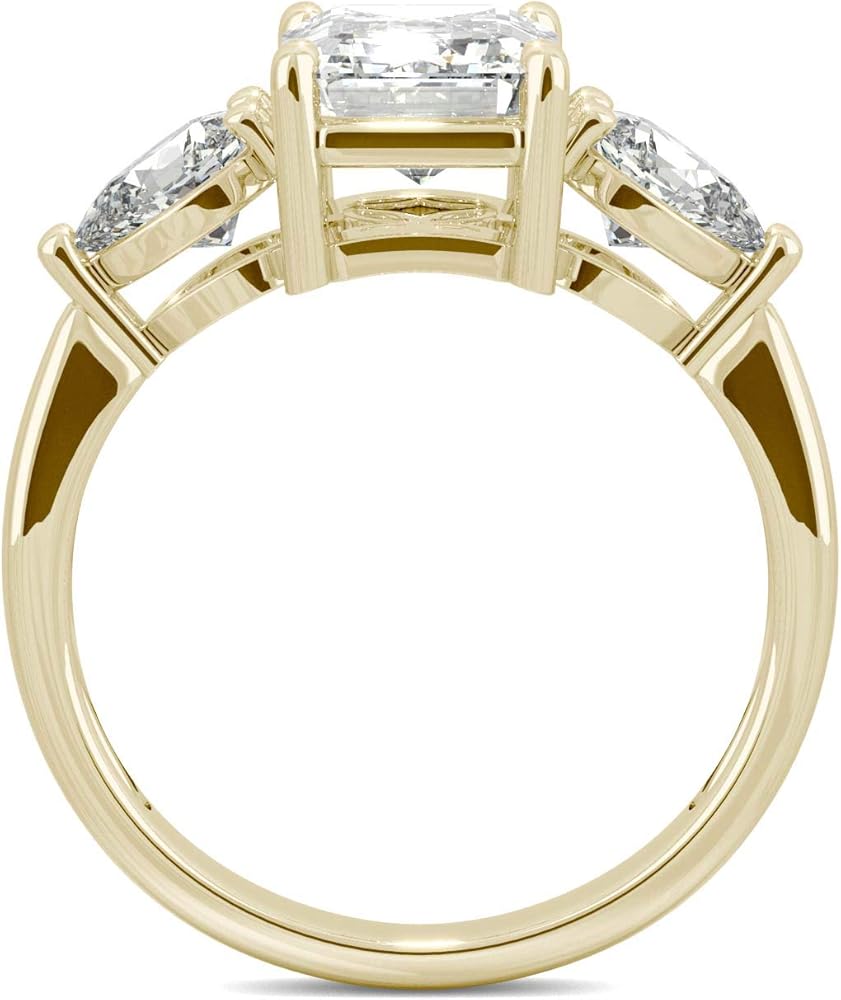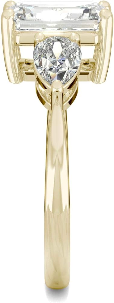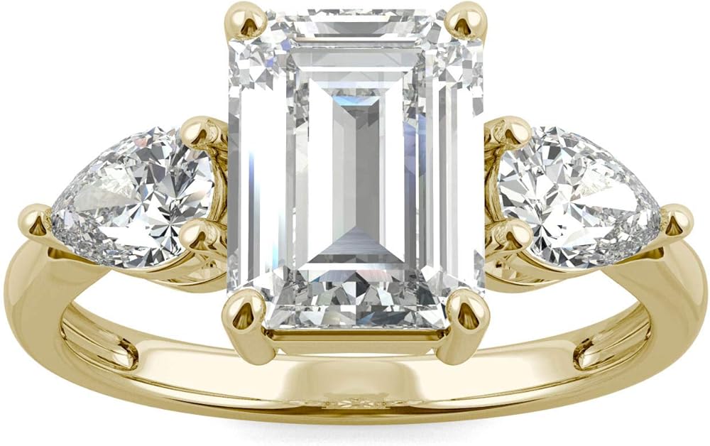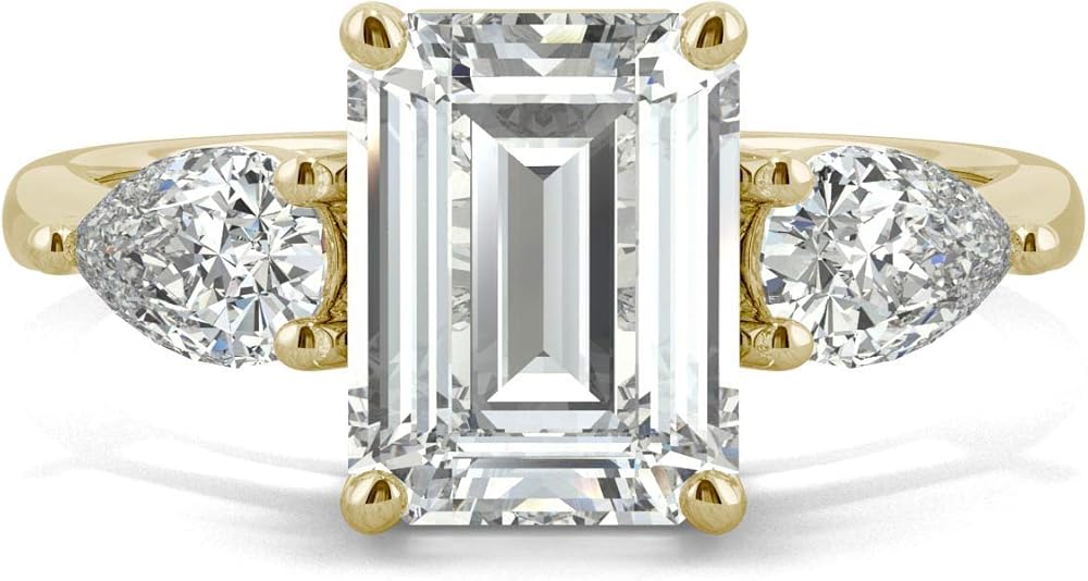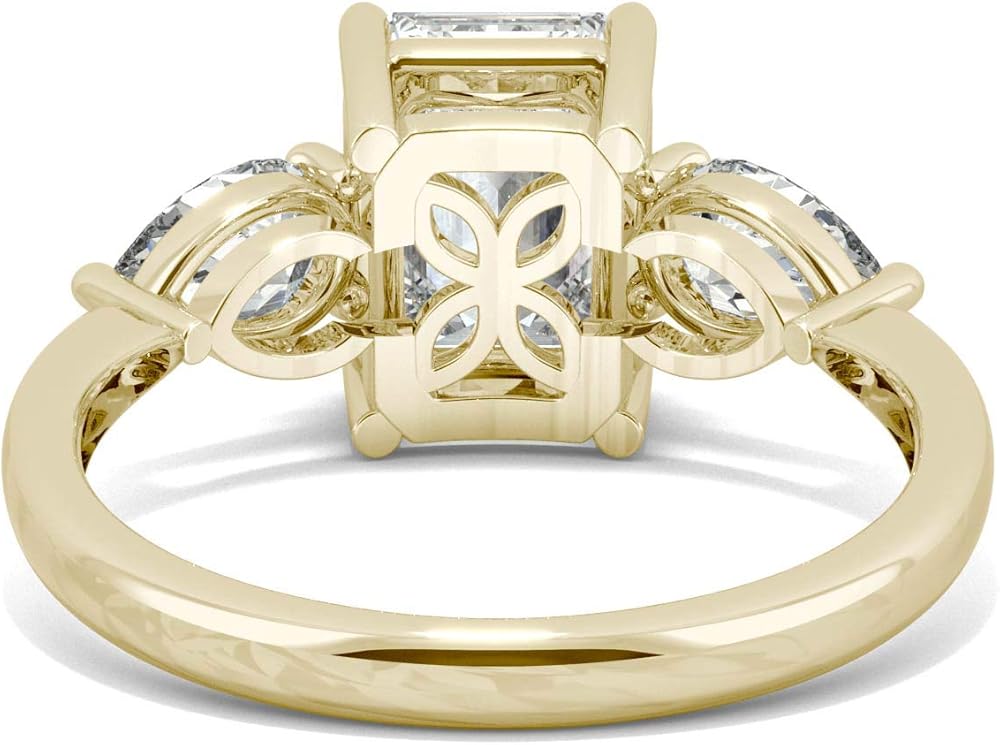 About the jewelry: This beautiful engagement ring showcases a 9x7mm emerald step cut Moissanite by Charles & Colvard gemstone. Beautifully crafted in 14K yellow gold and secured in a four prong setting. Ring size 6.