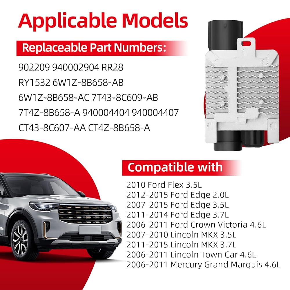 [Direct Fitment]: 940002904 Engine Cooling Fan Control Module Compatible with Ford Flex 3.5L 2010, Compatible with Edge 2.0L 2012-2015, Compatible with Edge 3.5L 2007-2015, Compatible with Edge 2011-2014 3.7L, Compatible with Crown Victoria 4.6L 2006-2011, Compatible with Lincoln MKX 3.5L 2007-2010, Compatible with MKX 3.7L 2011-2015, Compatible with Town Car 4.6L 2006-2011, Compatible with Mercury Grand Marquis 4.6L 2006-2011