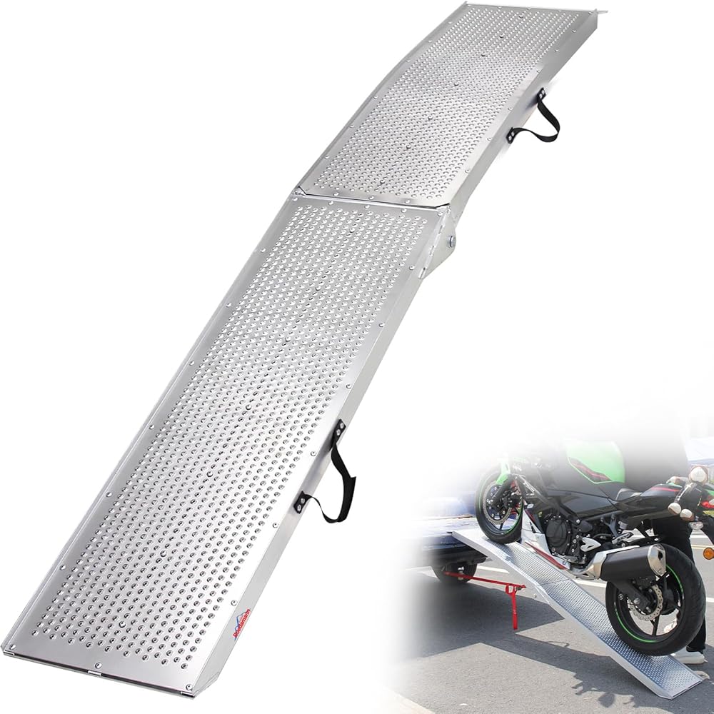 Heavy-Duty Aluminum Loading Ramp: Built from high-strength aluminum alloy for exceptional durability and structural support, each motorcycle ramp holds up to 750 lbs. Ideal for motorcycles, dirt bikes, and other two-wheeled vehicles. For loading heavier four-wheeled equipment such as ATVs, lawn mowers, UTVs, or small tractors, we recommend using two ramps for enhanced stability and weight distribution