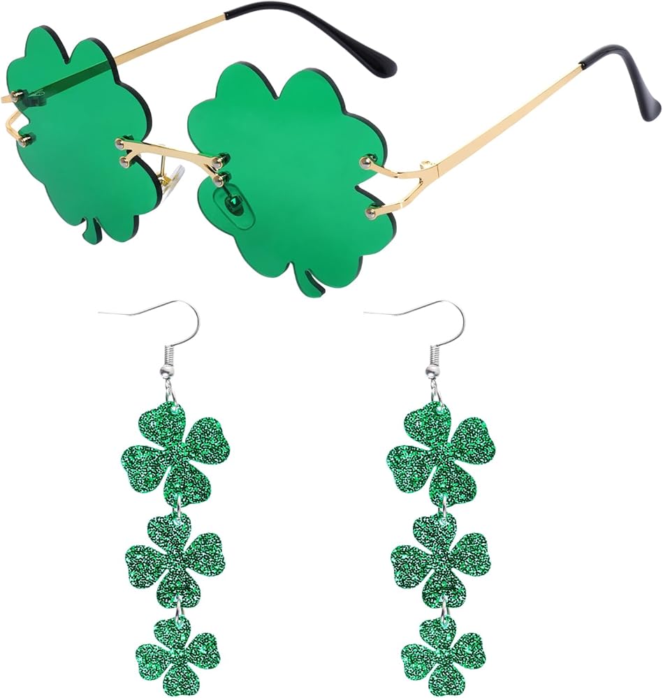Package includes: a pair of four-leaf clover earrings, a pair of four-leaf clover glasses