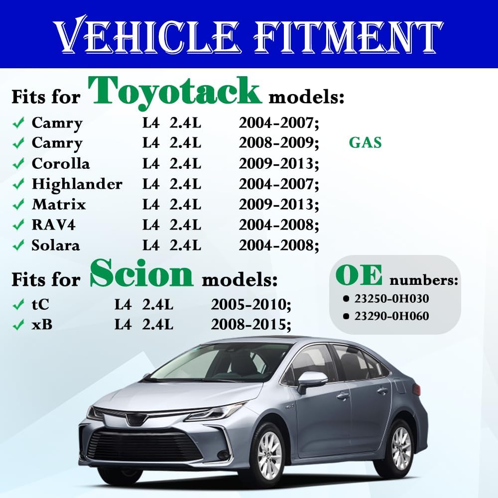 • 【FITMENT】- Compatible with Toyotack Models: Highlander L4 2.4L 2004-2007; Camry L4 2.4L 2004-2007; Camry L4 2.4L 2008-2009; GAS; Corolla L4 2.4L 2009-2013; RAV4 L4 2.4L 2004-2008; Matrix L4 2.4L 2009-2013; Solara L4 2.4L 2004-2008. Compatible with Scion Models: xB L4 2.4L 2008-2015; tC L4 2.4L 2005-2010.