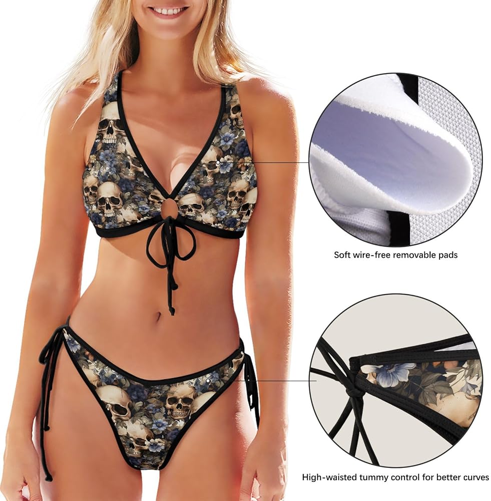 Style: Halter Neckline, adjustable ties at front, Strappy bikini bottom, support with removable padded bras