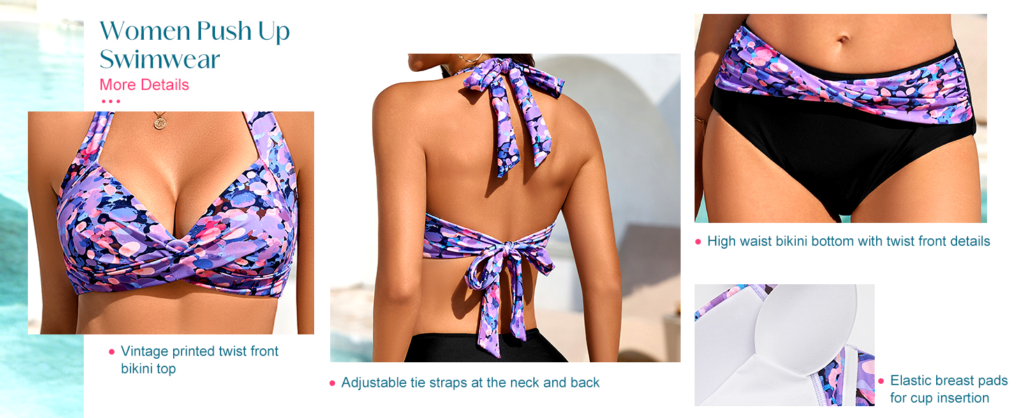 Chic Retro Prints - Features playful and cute floral printed swimsuit patterns with twist front details, creating a cute and vintage bikini vibe.