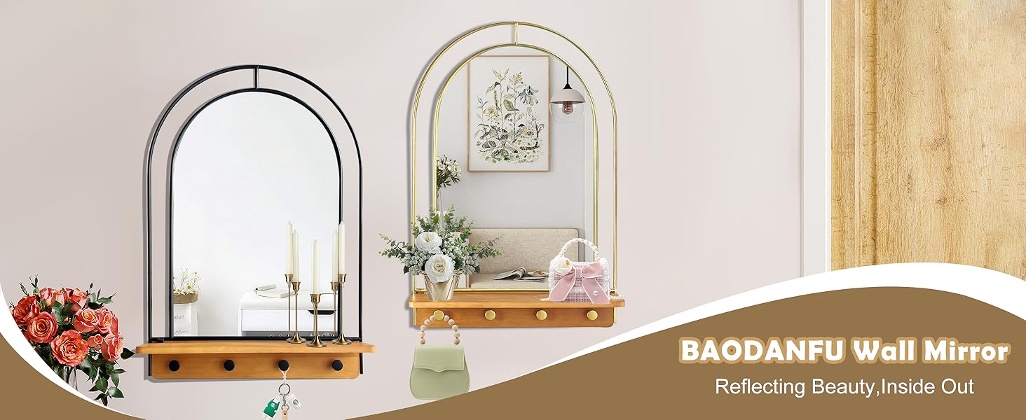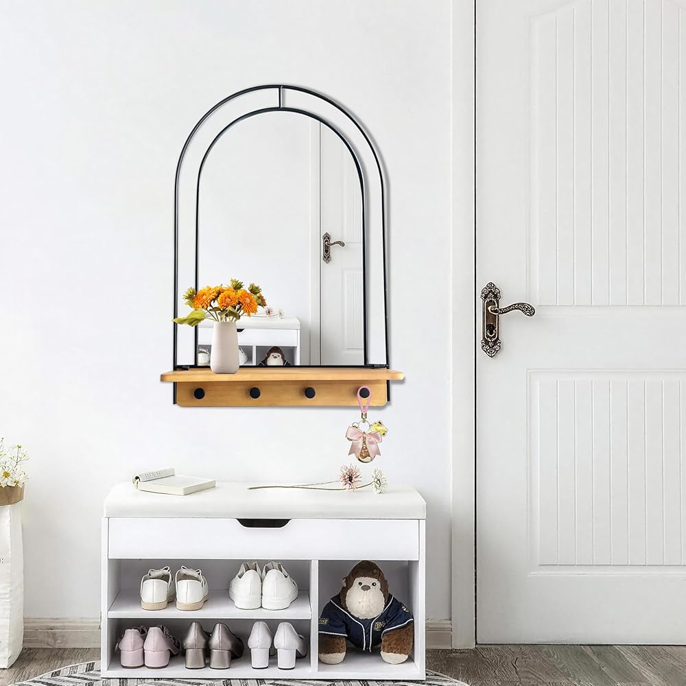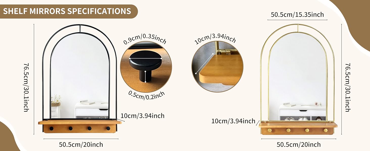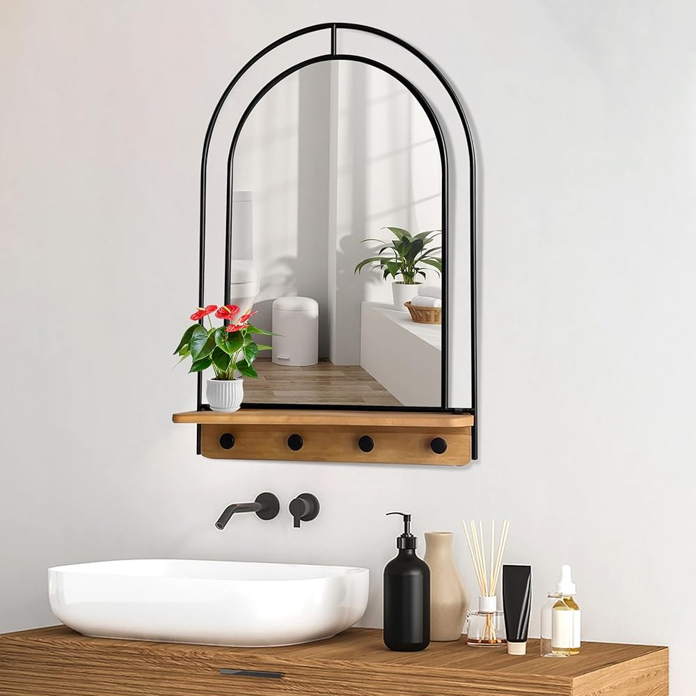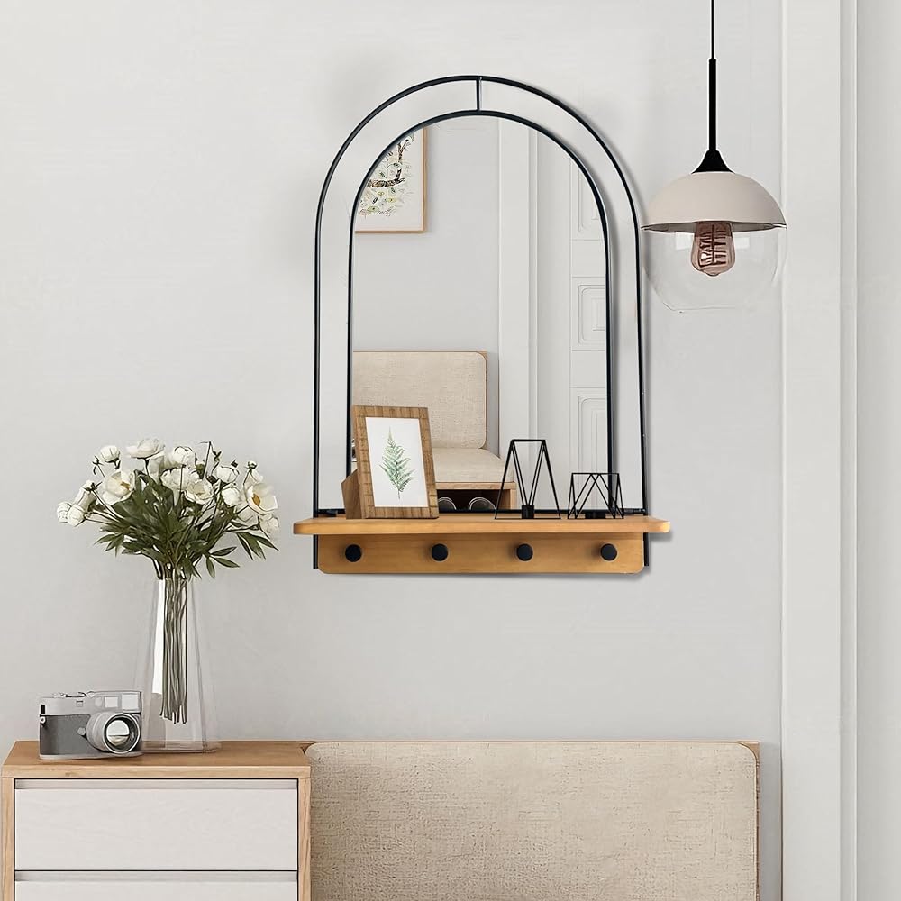 FUNCTIONAL WOOD SHELF: This black arch mirror includes a 20-inch wide by 3.94-inch deep natural wood shelf that provides convenient storage space for keys, cosmetics, perfumes, and decorative items, nice vanity mirror for dressing room, washroom, makeup room or over shoe cabinet Wall