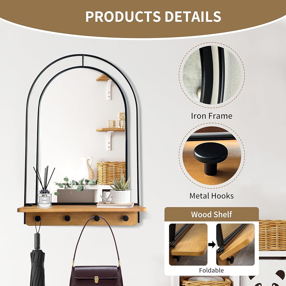 Wall Mirror with Foldable Wood Shelf, Black Bathroom Mirror with 4 Metal Hooks, 20x30 inches Arch Makeup Vanity Mirrors Decorative for Entryway, Bedroom, Dressing Room