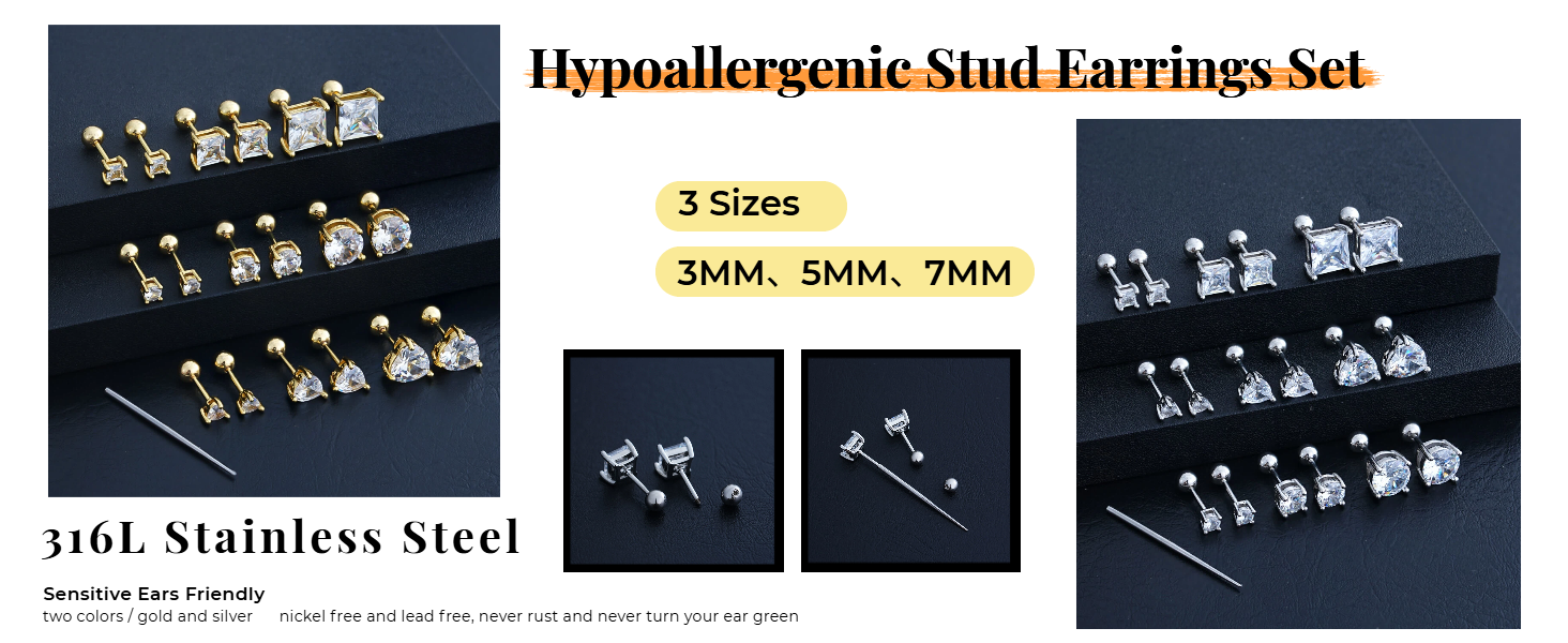 MULTI-SIZE STACKS STUDS EARRING SET:1 Set includes 9 pairs of cubic zirconia flat back studs(3mm/5mm/7mm) each pair comes with both ball backings and round flat backings, 1 externally threaded guide -a free gift for added style versatility.