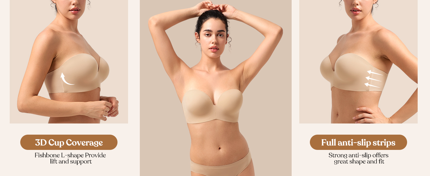 Seamless strapless bras for women is embedded with a soft cartilage support to prevent stretching and alteration of the cup shape during wear