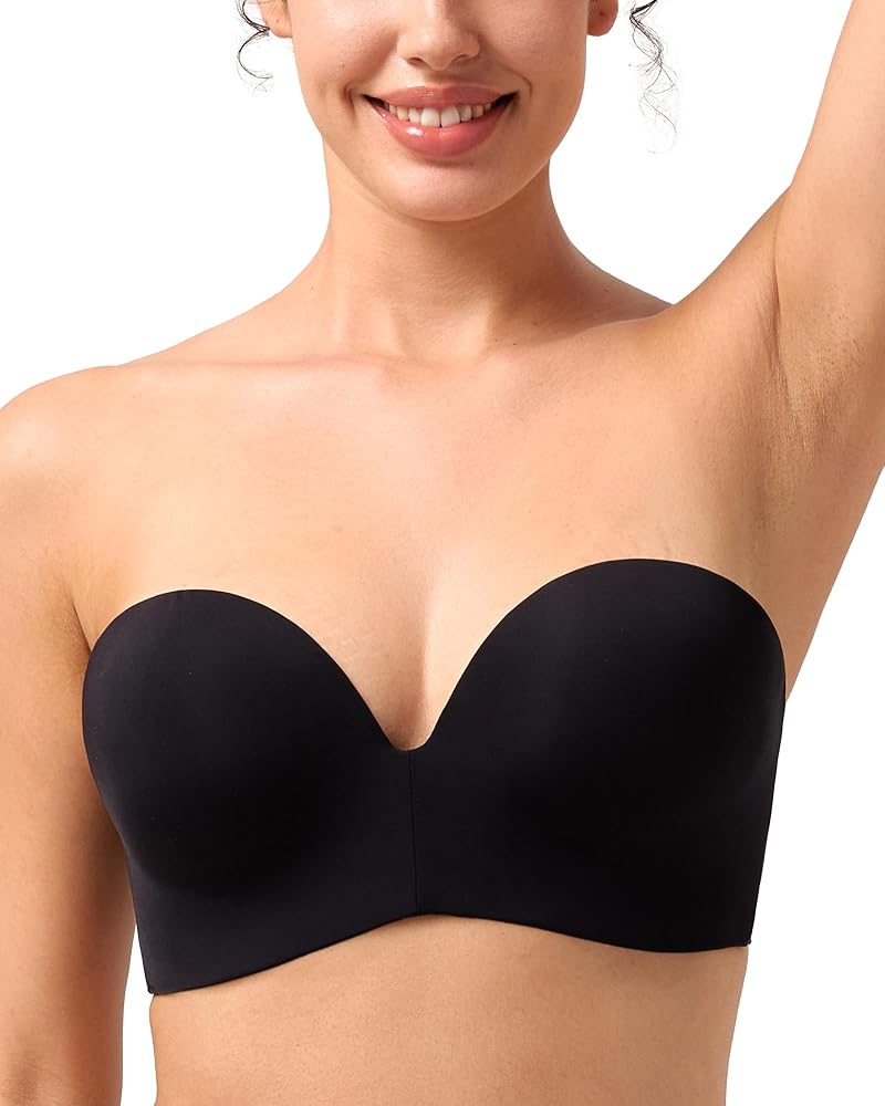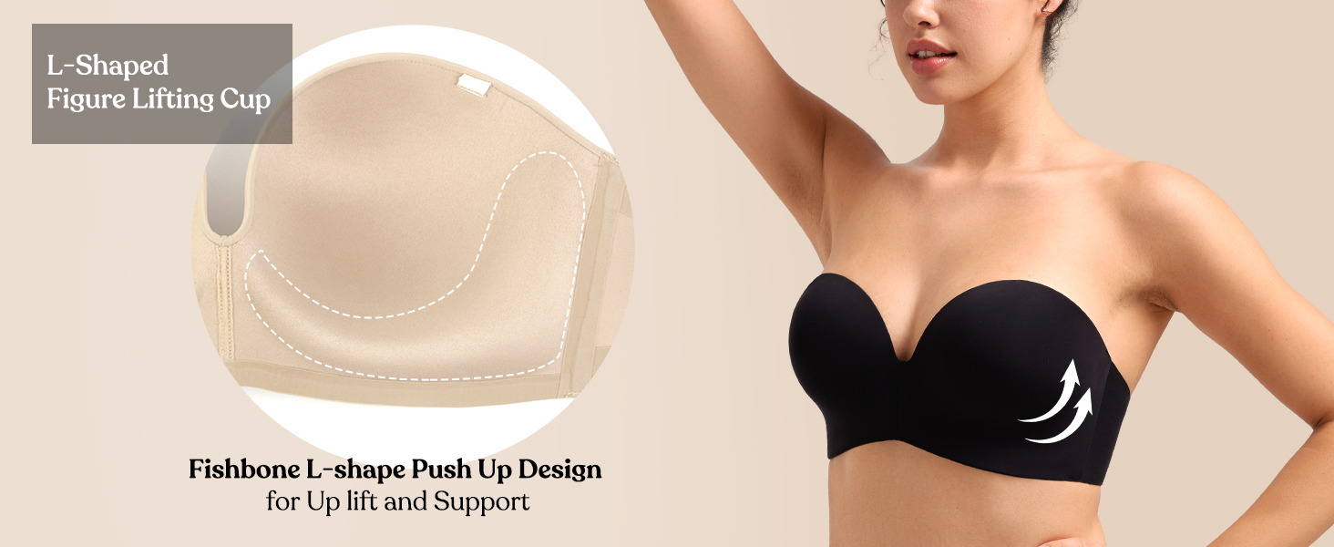 Push Up Strapless Bra: Seamless strapless bras for women is embedded with a soft cartilage support to prevent stretching alteration of the cup shape during wear wash, ensuring a stable and three-dimensional fullness of the bust. 3D Wirefree cup design to be comfortable & secure, without causing discomfort or digging into the skin.