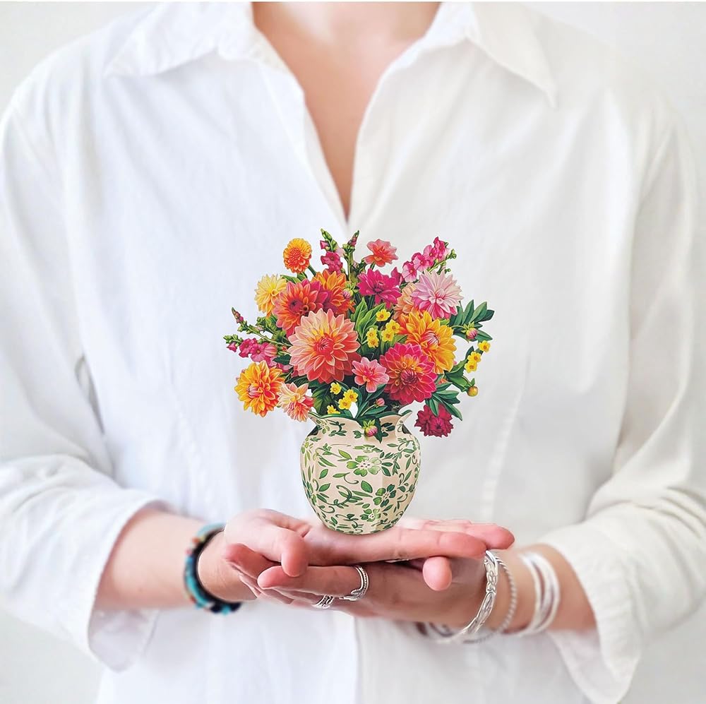 Freshcut Paper's pop-up floral bouquets feature whimsical, breathtaking blooms that never wilt and are thoughtfully crafted to last a lifetime. Each bouquet opens into a display of vibrant color and intricate detail, offering all the beauty of fresh flowers without the need for water or maintenance. Our ever-growing collection includes forever flowers, seasonal wreaths, modern paper gardens, and unique home décor pieces, each made from recyclable, earth-friendly materials that align with our commitment to sustainability. Every bouquet arrives with a coordinating blank greeting card and a ready-to-mail envelope, making gifting beautifully simple. Easy to pop open and display, these charming keepsakes add joy to any space, brightening desks, nightstands, entryways, and more. Whether sent across the miles or handed to someone special, our paper flower bouquets are perfect for celebrating birthdays, holidays, milestones, or everyday moments that call for a smile. With a wide range of imaginative, wilt-proof arrangements, it has never been easier to share lasting beauty and heartfelt sentiment with those you love.