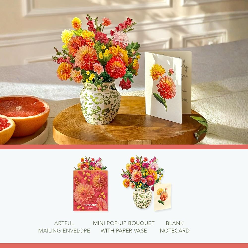 Freshcut Paper Mini Dahlia Sunrise Pop Up Cards, 6 Inch Mini Sized Forever Flower Bouquet 3D Popup Greeting Card, Birthday Cards, Valentine's Day Card, Blank Notecard & Envelope