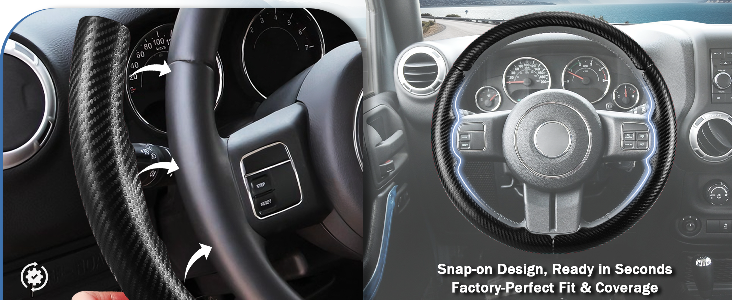 Ready in Seconds: Instead of hours of sewing, heating up with a hair dryer or waiting all day in the hot sun to soften it up, simply place the snap on steering wheel cover in place and press down. Installation takes only 1 minute or less.