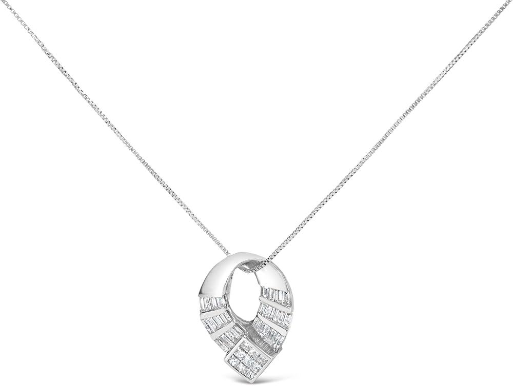Imbued with timeless elegance, this 14k white gold pendant necklace is a symphony of precision and sparkle, where 1 5/8 Cttw of natural diamonds blend in harmony. The pendant, an angled oval of polished white gold, showcases an ingenious composition of invisible set princess cut diamonds and vertically arranged channel set baguette diamonds. Each diamond, curated for its G-H color and VS2-SI1 clarity, plays its part in a meticulously structured performance of light. The curved design and fluid diamond transition imbue this piece with an air of sophistication, making it not merely an accessory but a testament to the art of craftsmanship. Attached to an 18 inch box chain, it hangs with a confidence that complements the wearer's grace. Perfect for those who cherish elegance and the undeniable allure of carefully crafted diamond jewelry. Secures with spring ring.