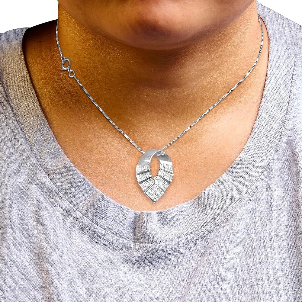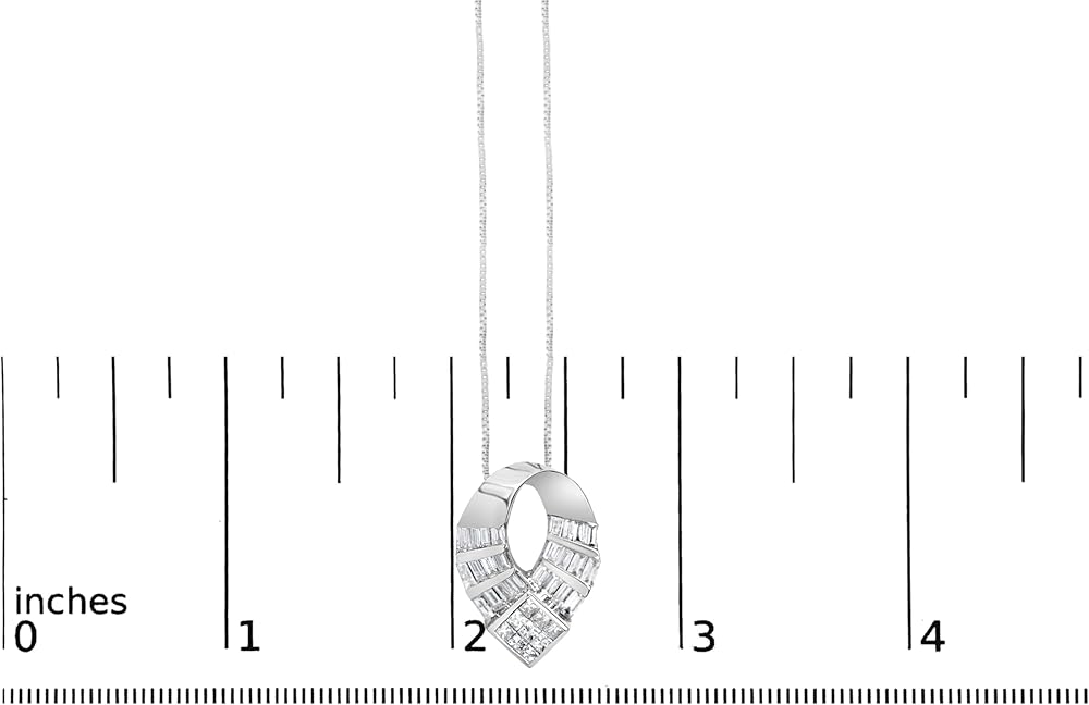 IRRESISTIBLE GLAMOUR - Experience timeless elegance with this 14k white gold necklace, boasting 1 5/8 Cttw of G-H color, VS2-SI1 clarity natural diamonds. The pendant's distinctive curved oval shape features a masterful blend of invisible set princess cuts and channel set baguette diamonds, creating a dynamic display of sparkle. Paired with an 18-inch box chain, this piece is a testament to sophisticated design and exquisite craftsmanship.