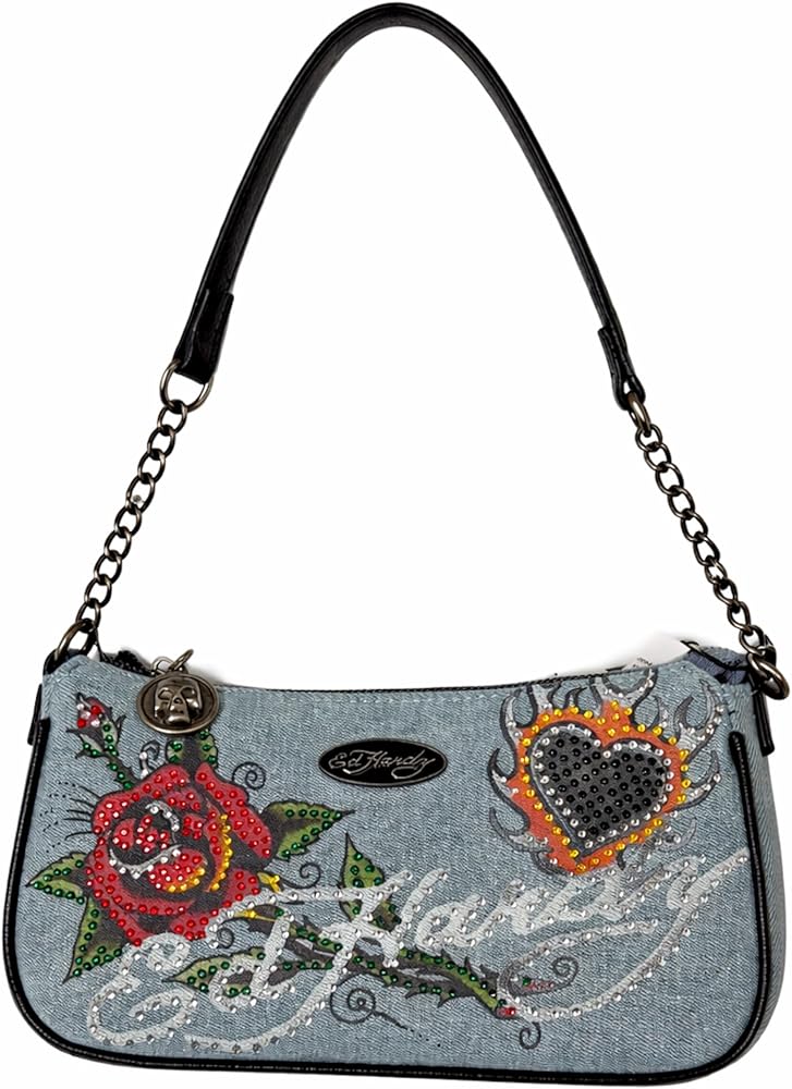 The NWT Y2K Ed Hardy Denim Crossbody Bag is a stylish and trendy accessory perfect for women who love a pop of floral detail. With denim exterior and a zip closure, this bag is both fashionable and functional. The crossbody style adds a touch of convenience and versatility, while the inner pockets provide extra storage for your essentials. Perfect for everyday wear or a night out, this bag combines edgy design with practical features for a must-have accessory.