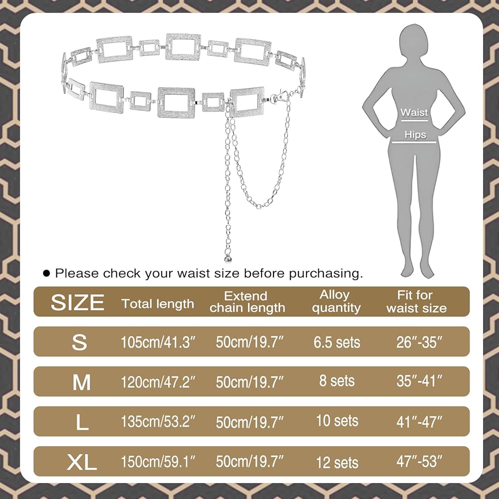 Size: This adjustable chain belt provides a custom fit with four sizing options: 105cm (26"-35"), 120cm (35"-41"), 135cm (41"-47"), and 150cm (47"-53"). Designed to accentuate your curves, it's the perfect belly chain for women seeking a confident and stylish silhouette