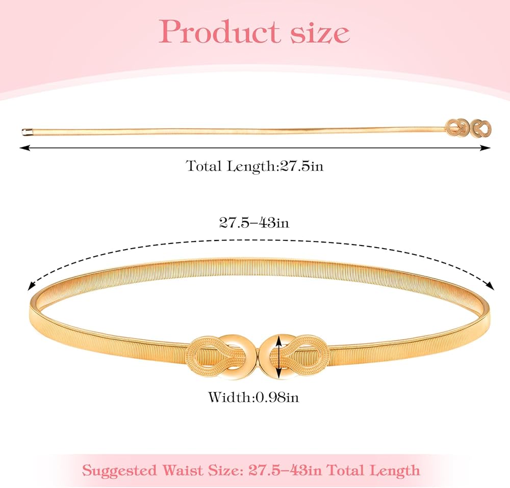 【Universal 27.5-Inch Length】Measuring 27.5" long and 0.39" wide (fits 28-43" waists), this women's gold belt adjusts easily via its metal clasp and lies flat to prevent clothing snags.