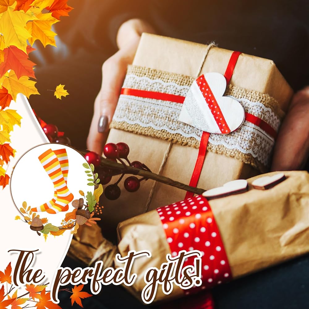 Halloween Themed Design: these stockings are printed with orange, yellow and white stripes, which is a classic Halloween element color scheme, nice for enhancing the Halloween atmosphere or as Halloween gifts