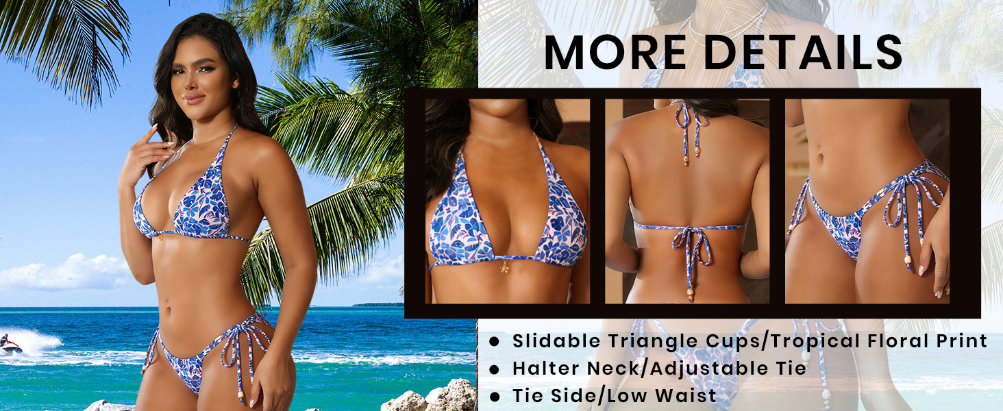 Chic bikini tops: this Halter Bikini Set features Adjustable ties , Slidable triangle cups,Breathable and fully lined,floral print detailing for a more glamorous and personalized look