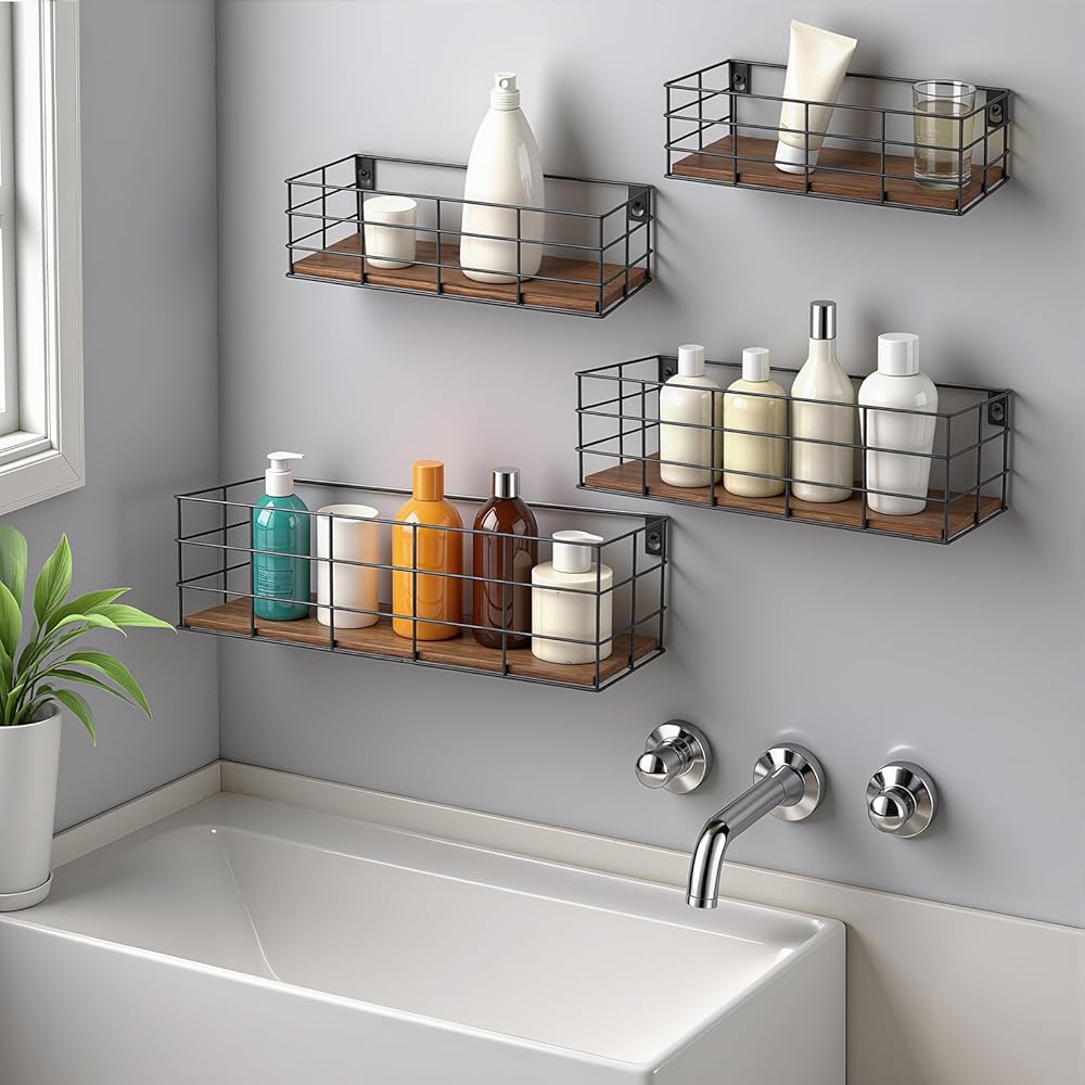 4 Sets of Hanging Floating Shelves, Metal Wire Storage Basket with Wood Bottoms, Hanging Storage Wall Shelf, Wall Mounted Shelves for Home Bathroom Living Room Bedroom Kitchen