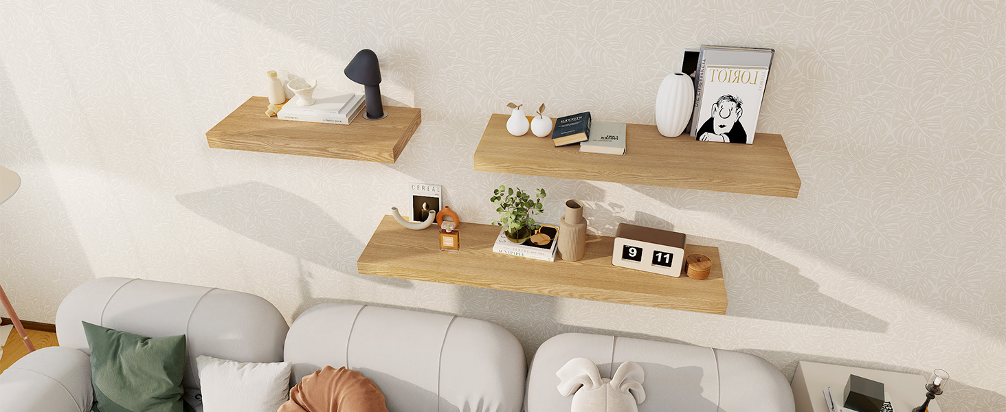【DECORATIVE & FUNCTIONAL】The wall-mounted floating shelves are designed for decoration and storage, utilizing and decorating any space in your home. Used as shelf decor to show your collection, books, or prize, the hanging shelves are perfect for displaying your photo frame, small plants, model, or audio in your living room, office, study. And can also use as over the toilet storage shelf in the bathroom to hold toiletries or used as kitchen shelf to storage condiments.