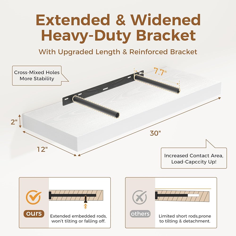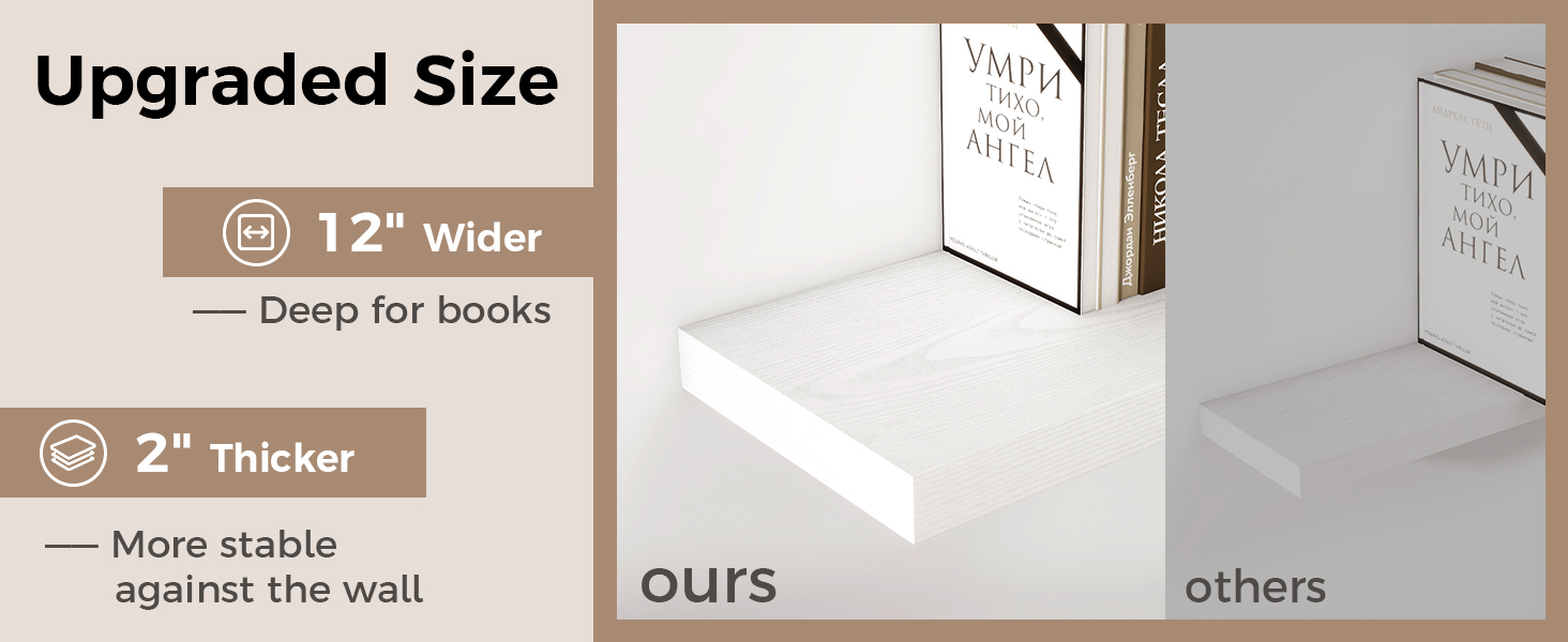 【12 INCH DEEP FLOATING SHELF】This extra deeper and thicker wall shelves are 12 inches in depth and 2 inches in thickness instead of the regular narrow floating shelves, you can put photos, pictures, DVD players, videos, books, toys, and some other knickknack on this beautiful display wooden shelf.