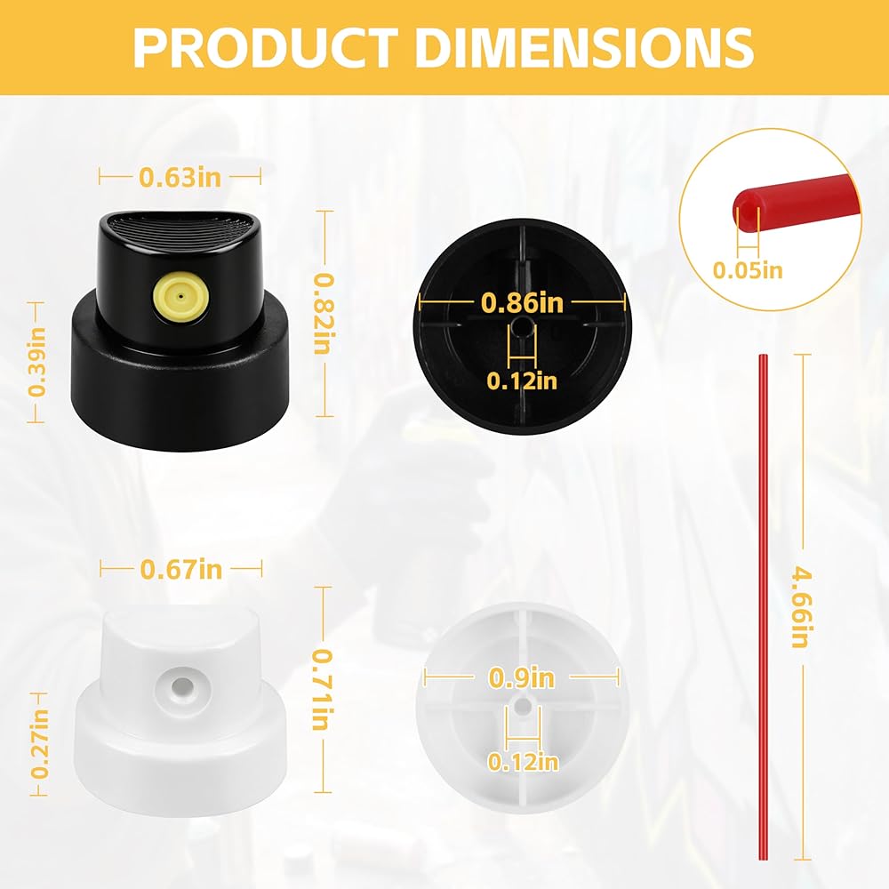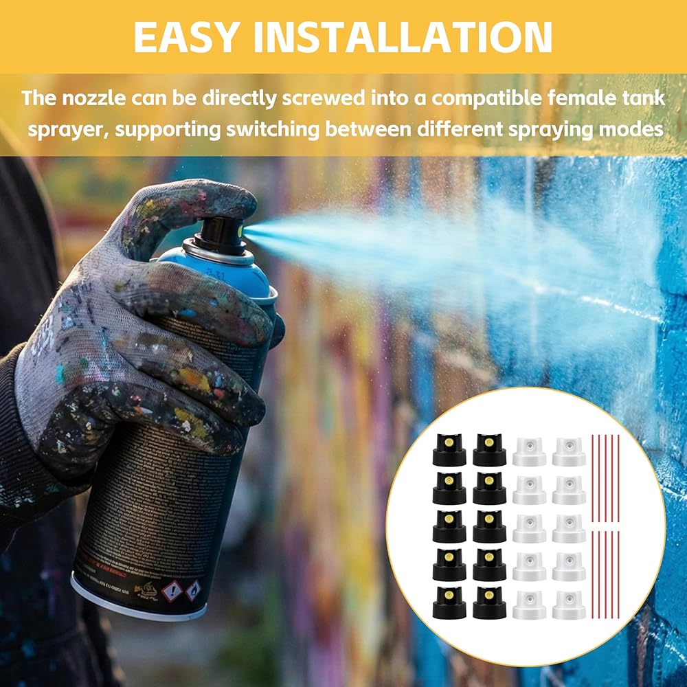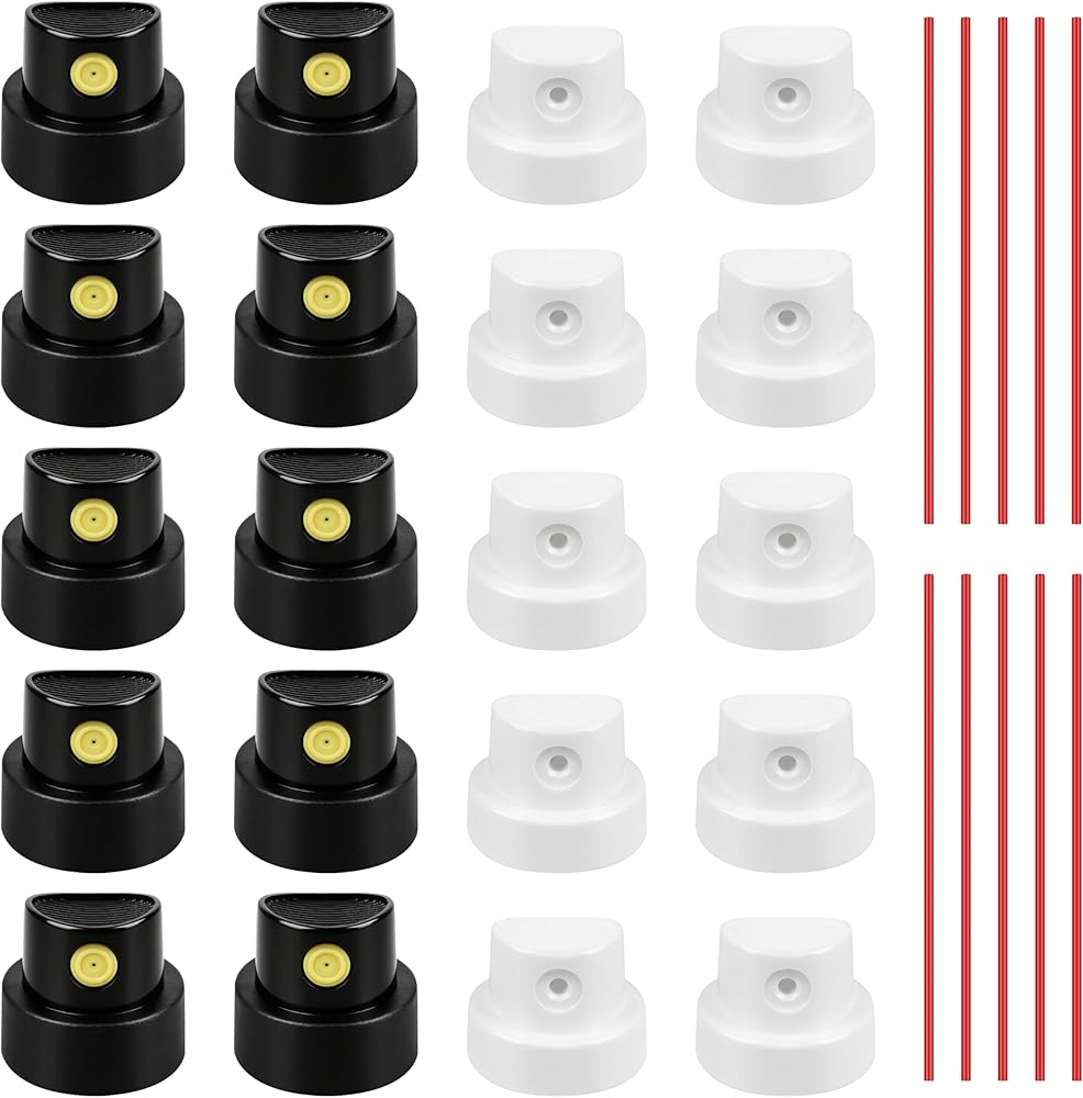 Elevate your spray painting projects with this 20-pack spray paint caps, designed for most standard spray aerosols. Versatile nozzle tips support thin and wide lines, delivering precise details or broad coverage as needed. Ensures perfect compatibility with most spray paints for optimal performance. Enhance your painting experience and achieve professional results effortlessly with this convenient cap pack.