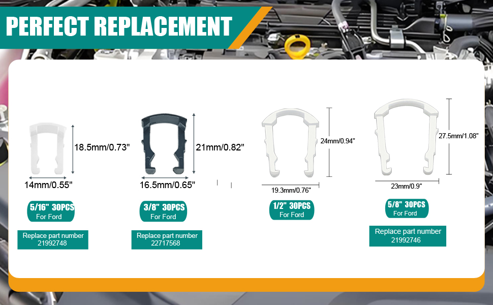 30PCS CLIPS FOR 3/8" FUEL LINE: Fit Ford N802241-S, N806190-S1901 (With Fuel Injection) 1980-; Fit Ford N802241-S, N806190-S1901 (With Fuel Injection) 1980-on; 7L3Z-9S317-B; Fits Ford F Series Pick-Up 2004 -; 15638098, 22717568, 2F1Z9A317BA.