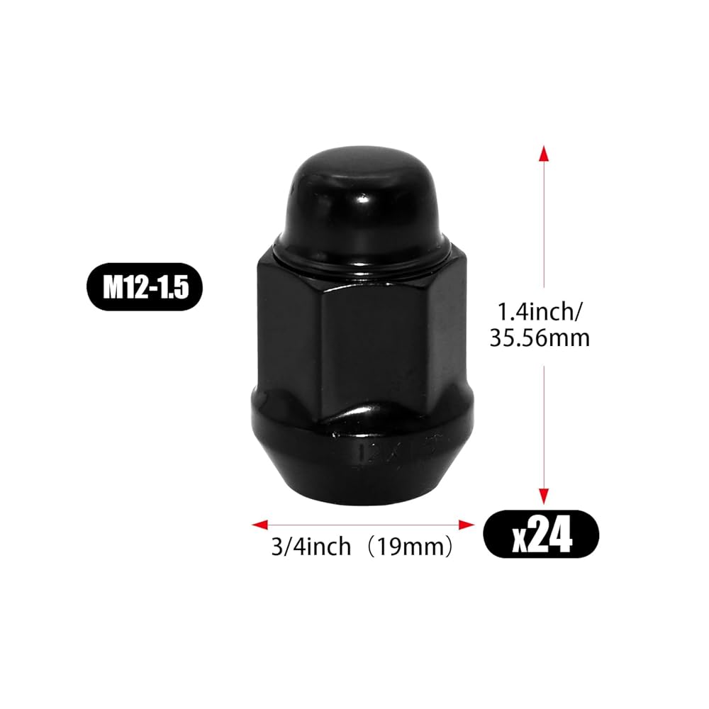 SPECIFICATION - M12x1.50 thread - Closed End Bulge Acorn Style Lug Nuts - Conical 60 Degree Seat - 19mm hex - 35.56mm long - 22.1mm wide, 24Pcs Black Closed End Bulge Acorn Lug Nuts