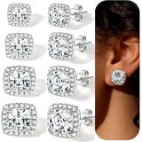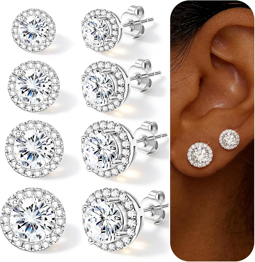 4 Pairs Silver Stud Earrings for Women, 18K Silver Plated Hypoallergenic Premium Cubic Zirconia Earrings, Halo Round Square Stud Earrings Set for Women Men