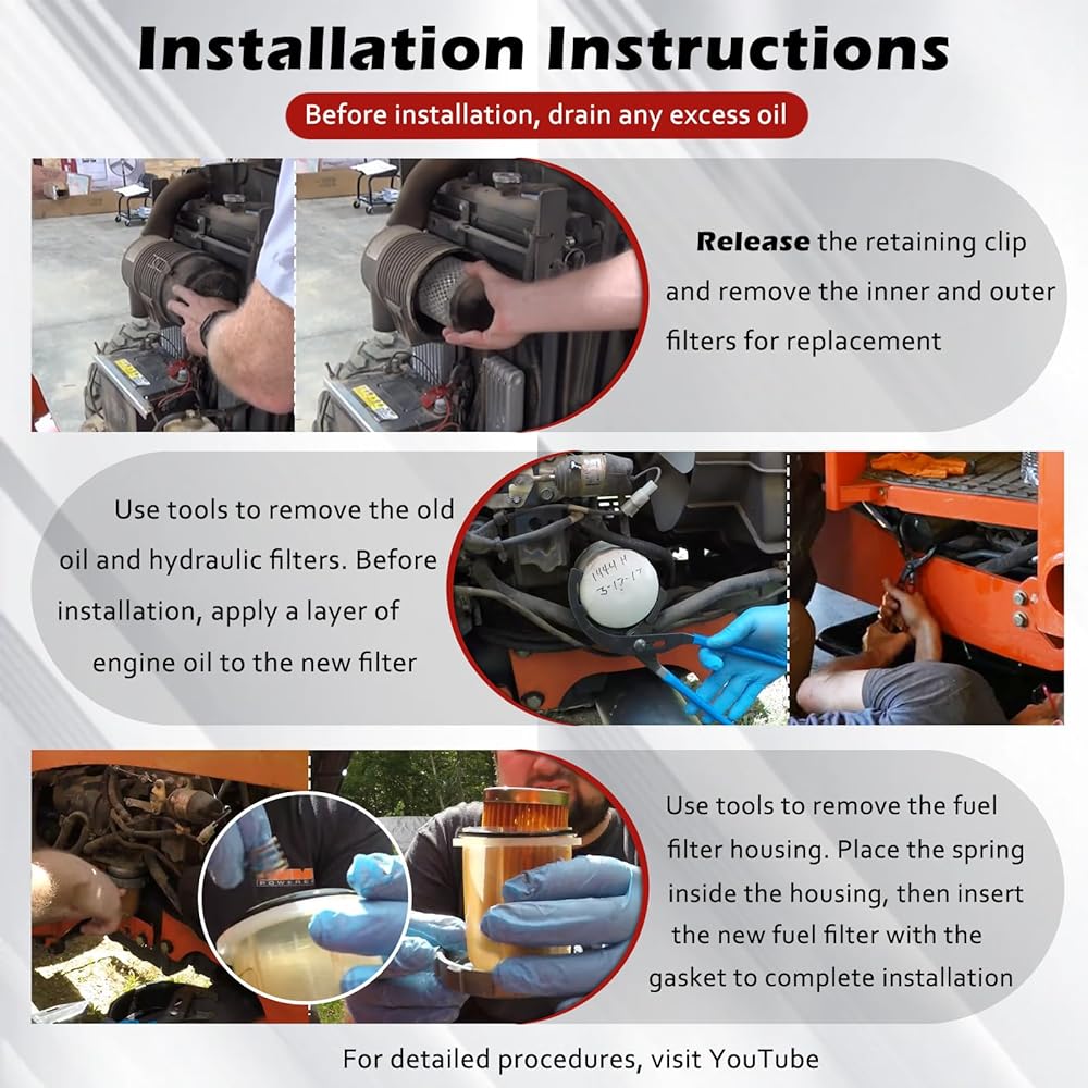 【Function】Dual-stage filtration with internal and external filters blocks dust and debris from the air; the oil filter removes metal shavings and impurities from engine oil; the hydraulic filter maintains clean hydraulic fluid to ensure precise and reliable transmission and lifting systems; the fuel filter separates water and particulates from diesel fuel. Working together, they provide superior protection for engine performance