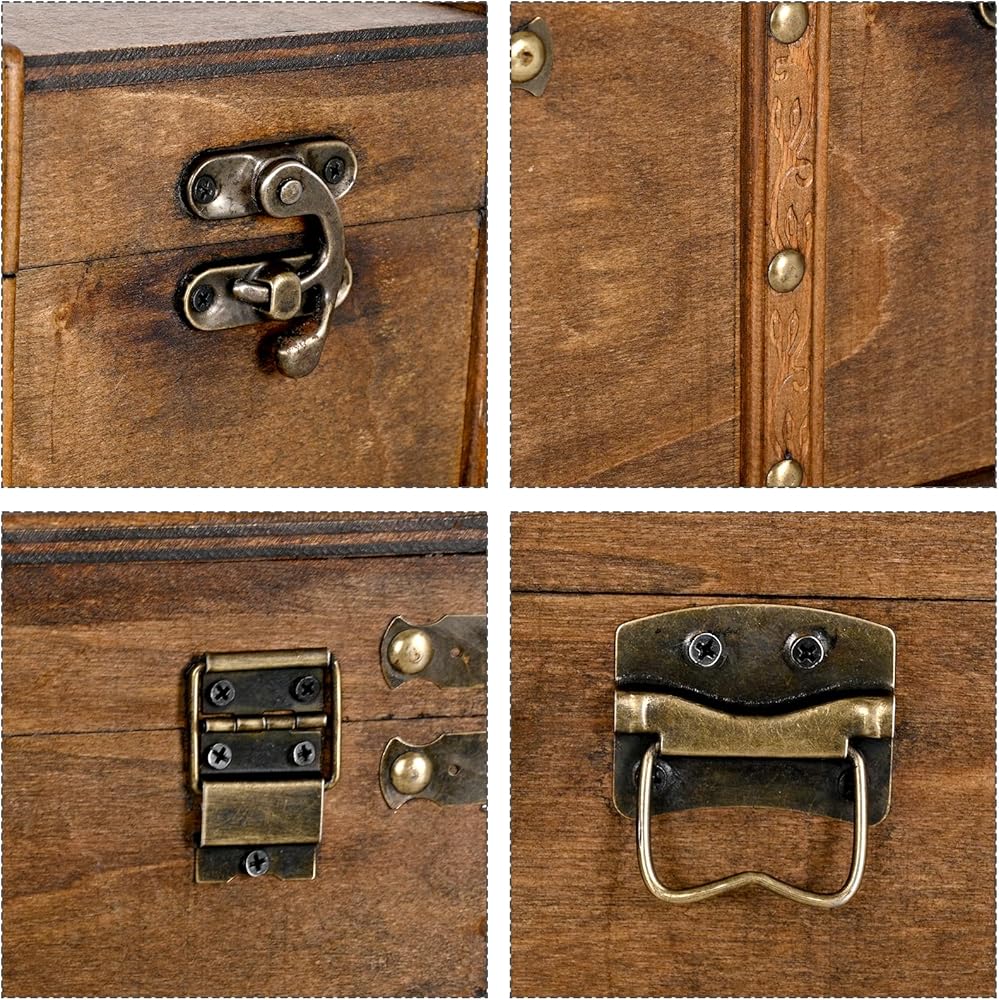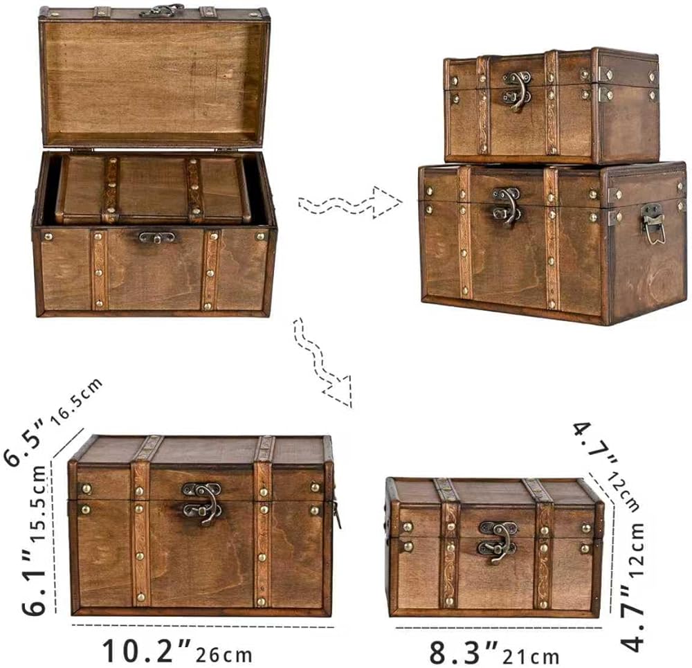 Bring classic vintage charm into your home with the DECOR4SEASON Wooden Storage Trunk Set of 2. Designed with an authentic rustic finish, each chest showcases engraved decorative wood strips, brass-tone rivets, and antique metal latches that create a timeless handcrafted look. The set includes a large and small trunk that nest together, giving you flexible storage options without taking up unnecessary space. These trunks are ideal for organizing keepsakes, jewelry, photos, letters, crafts, remote controls, or small household essentials while doubling as eye-catching decorative accents. Whether placed on a console table, bookshelf, coffee table, or bedside, they instantly elevate your décor with warmth and character. Made from durable solid wood panels and reinforced with sturdy metal hardware, these trunks are built for long-lasting use and reliable protection of your items. Their versatile styling fits farmhouse, rustic, vintage, boho, cottage, and traditional interiors with ease. Perfect for personal use or gifting, this beautiful wooden trunk set makes a thoughtful present for housewarmings, weddings, anniversaries, holidays, or anyone who appreciates vintage home décor and functional craftsmanship.
