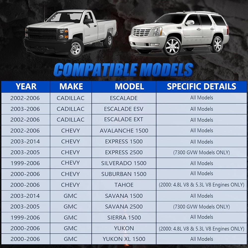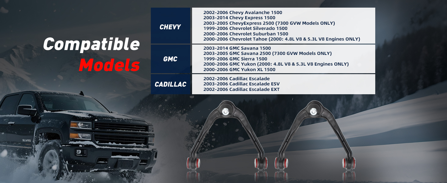 Direct Fit for Chevy: The upper control arms fit for Chevy Silverado 1500 1999 - 2006, Tahoe 2000 - 2006 (2000: 4.8L V8 & 5.3L V8 Engines Only), Suburban 1500 2000 - 2006, Avalanche 1500 2002 - 2006, Express 1500 2003 - 2014, Express 2500 2003 - 2005 (7300 GVW Models Only)