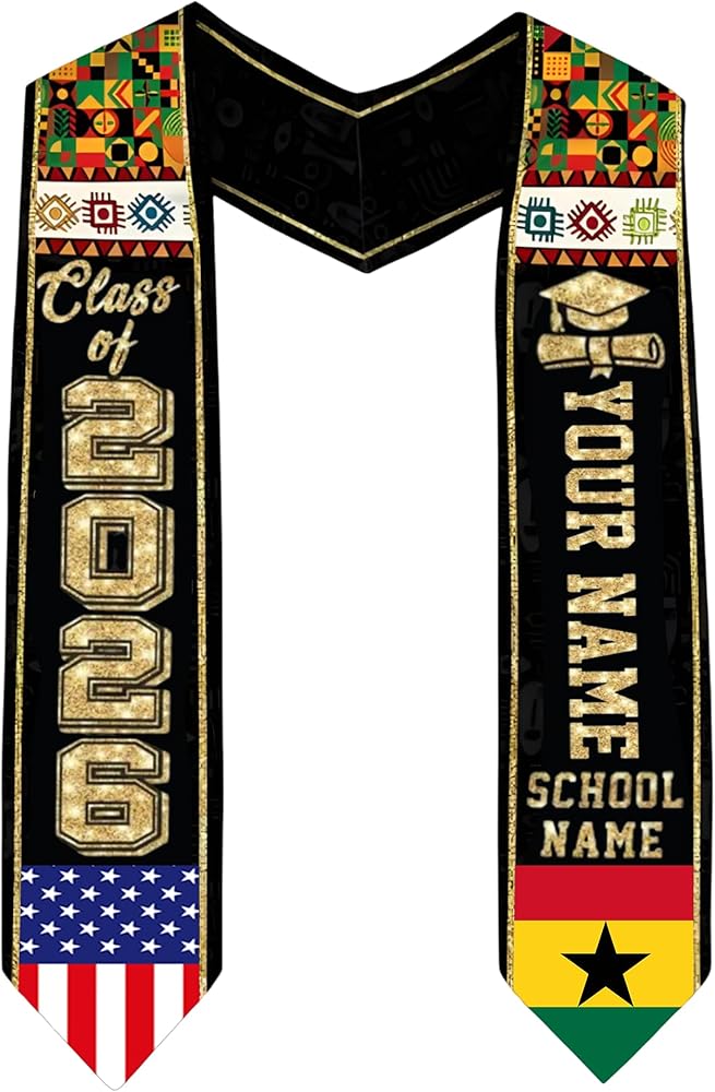 Ghana Graduation Stole: Designed with both Ghana Flag and USA Flag, perfect for graduates honoring their roots and American journey. These personalized graduation stoles would make wonderful graduation presents for your friends, daughter, son, ghana stole, graduation gifts for girls, ghana sash, ghana graduation sash, ghana graduate stole, custom graduation stole, american graduation stole.