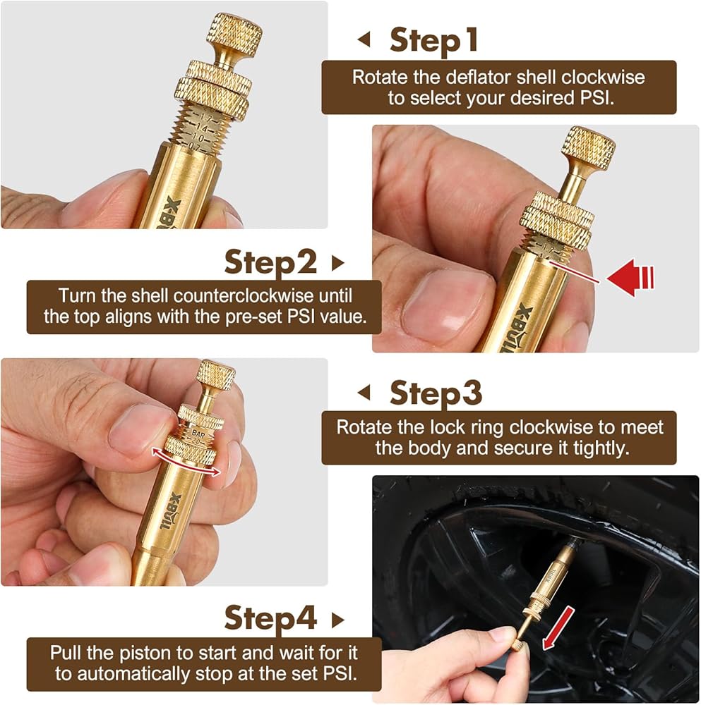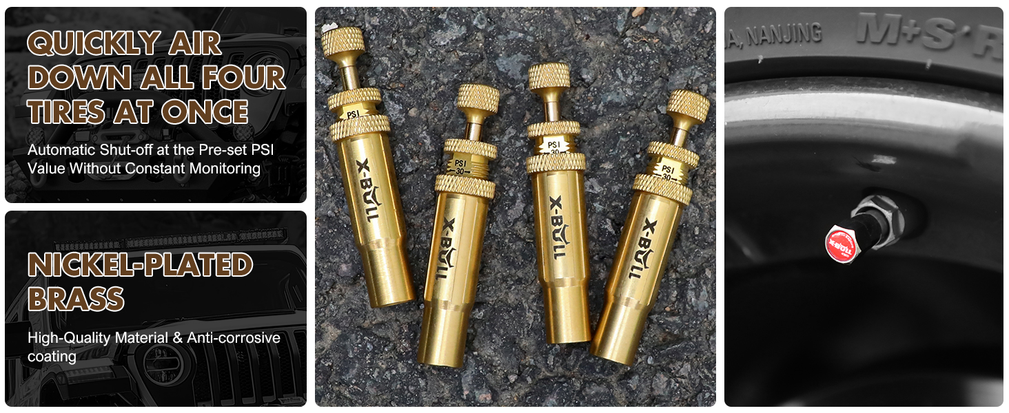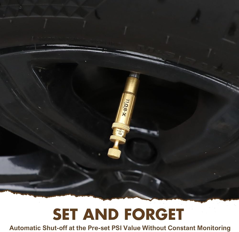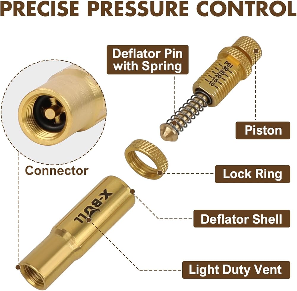 التفريغ الفعال والإيقاف التلقائي: تتيح لك مجموعة صمامات تفريغ الإطارات ذات الإيقاف التلقائي تفريغ الإطارات بسرعة ودون أي متاعب. بمجرد ضبط PSI المطلوب (في حدود 10-30 PSI)، يتوقف الصمام تلقائيًا عن تفريغ الهواء - لا حاجة إلى مراقبة يدوية. قل وداعًا للركوع بجانب عجلاتك!