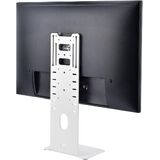This universal low-profile black monitor stand supports landscape/portrait installation, features adjustable height during installation, and allows flat monitor placement