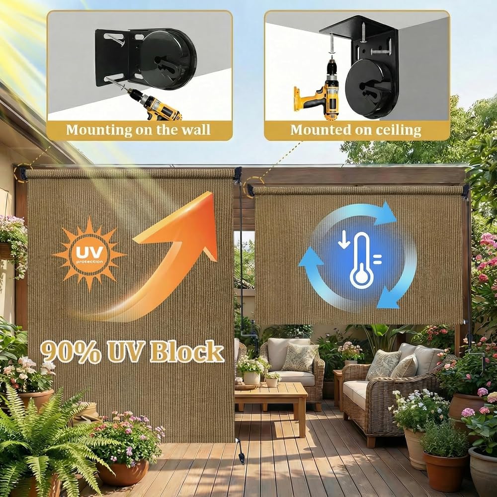 KANAGAWA Outdoor Roller Shade offers standard 4FT–12FT widths and fully custom sizes, with 5 color options to match your home decor. Crafted from 220GSM breathable HDPE fabric, it blocks up to 90% harmful UV rays, reduces heat and creates a cool, airy space. Ideal for porches, patios, balconies, gazebos and decks. All installation accessories and instructions are included for easy wall/ceiling setup. The spliced poles ensure compact shipping and prevent sagging, while the shade fabric stays seamless and neat.