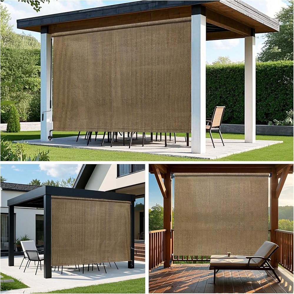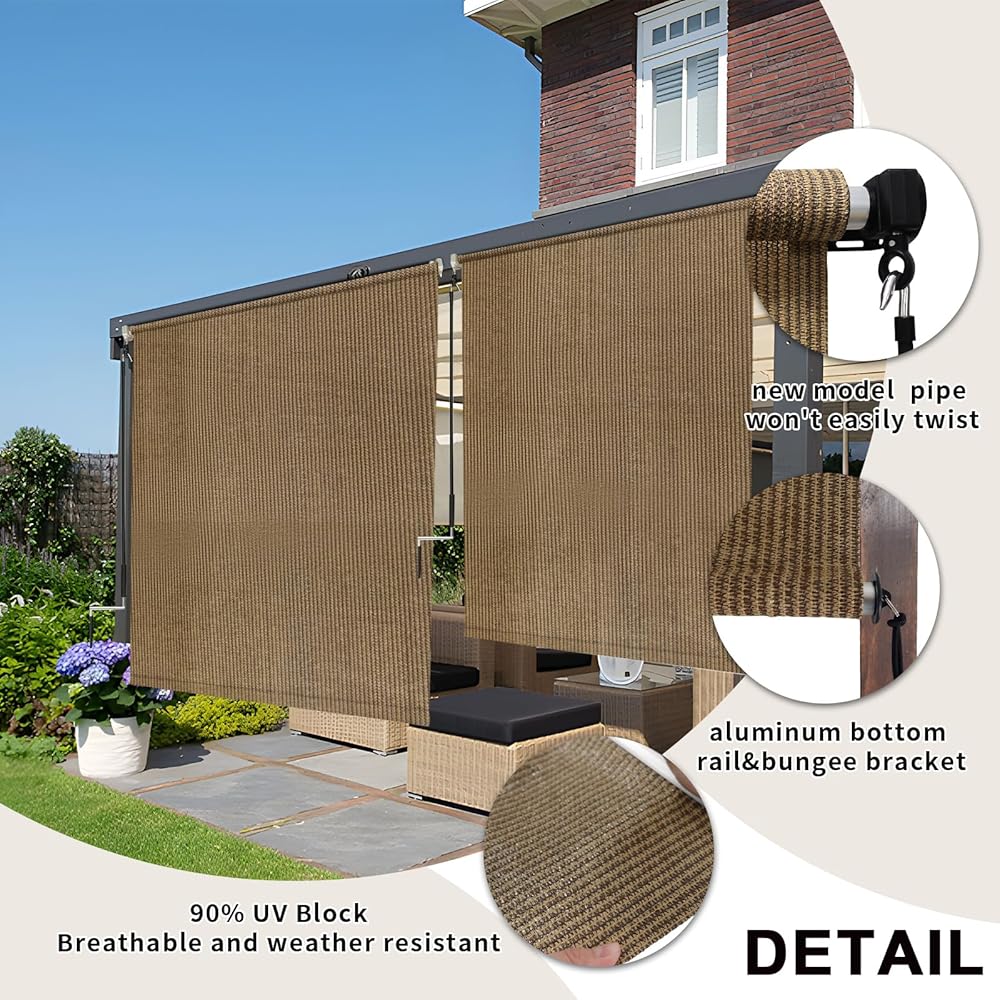 KANAGAWA 12' W x 8' H Patio Shades Roll Up Blinds with Splicing Design, Cordless Outdoor Roller Shades for Outside, Exterior Roller Sun Shade Cloth for Porch Pergola Balcony Backyard, Walnut
