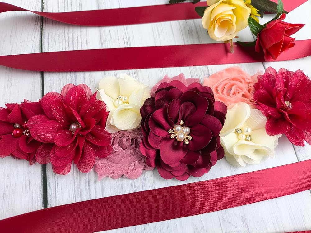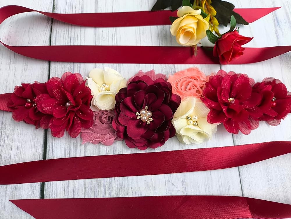 VERSATILE DESIGN: Elegant burgundy sash belt featuring a beautiful flower accent, perfect for adding style to maternity outfits and formal dresses