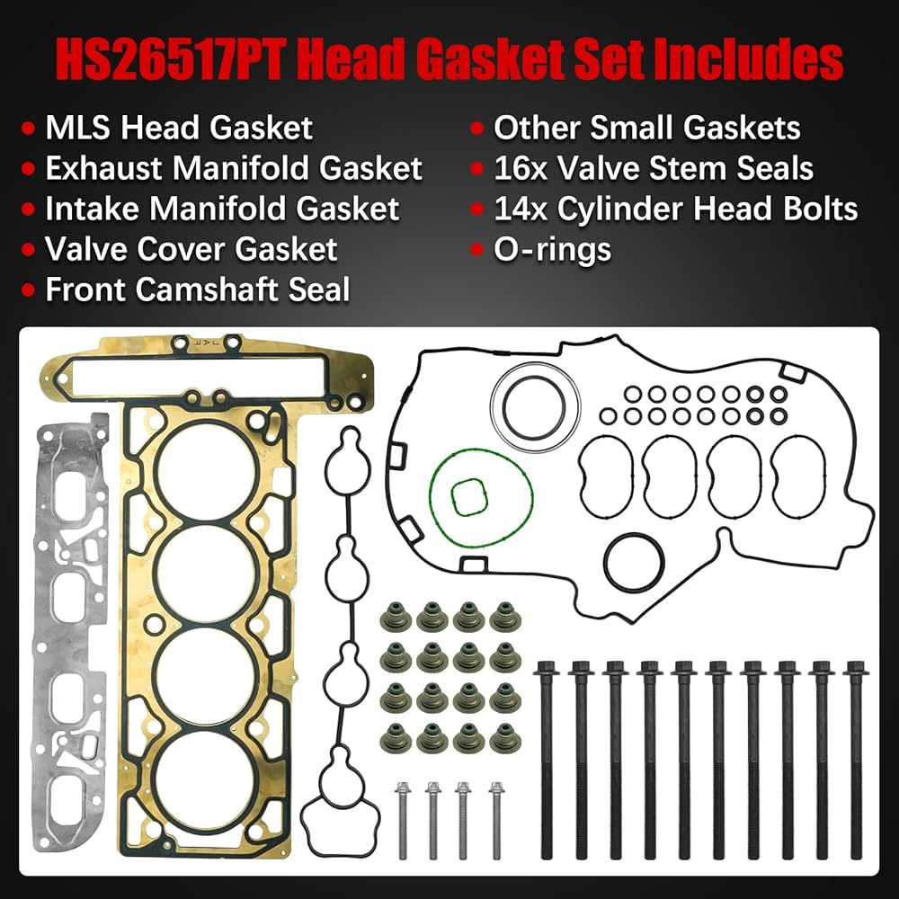 Package Included: Timing Chain, Timing Guide, Tensioner, MLS Head Gasket, Water Pump, VVT Solenoid, Valve Cover Gasket, Intake Manifold Gasket, Valve Stem Seals, Front Camshaft Seal, Exhaust Manifold Gasket, RTV Silicone, Head Bolt, O-rings and Other Small Gaskets. Please confirm the vehicle model, appearance and OE number before purchasing the 2.4l timing chain head gasket