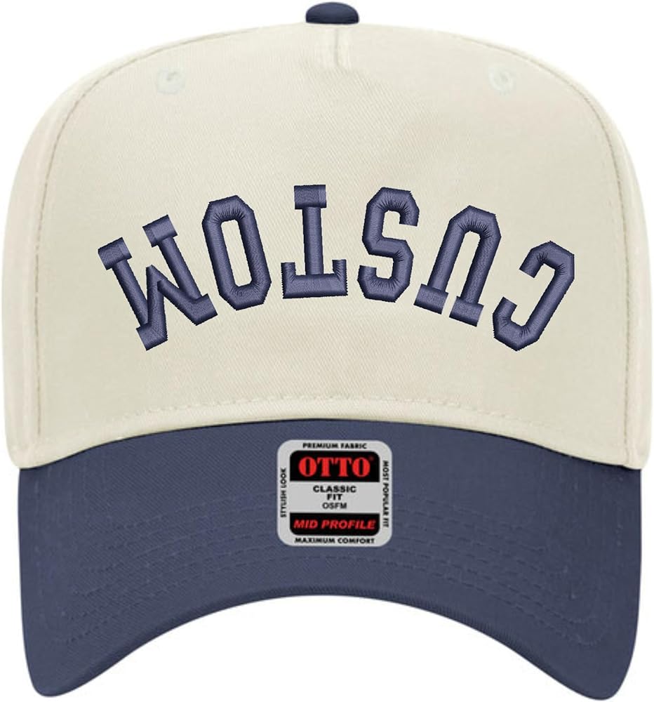 Customize this trendy two tone five panel snapback cap with your custom text that comes upside down rlly style. Each phrase will be embroidered in a thread color that matches the bill of the hat unless selected otherwise.